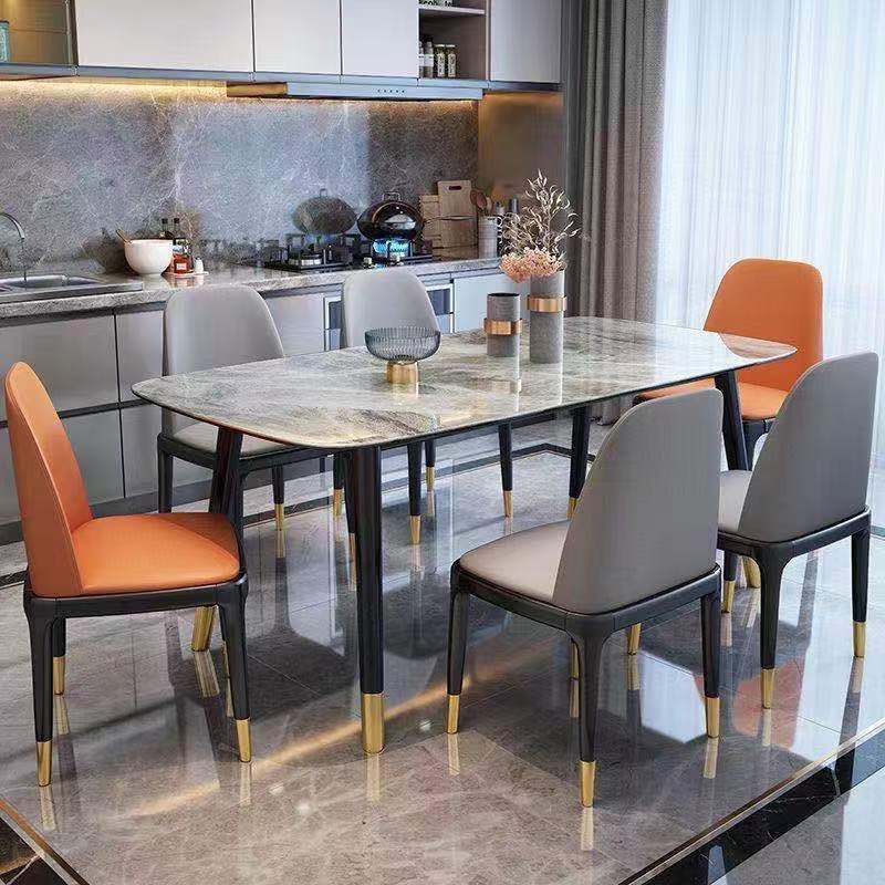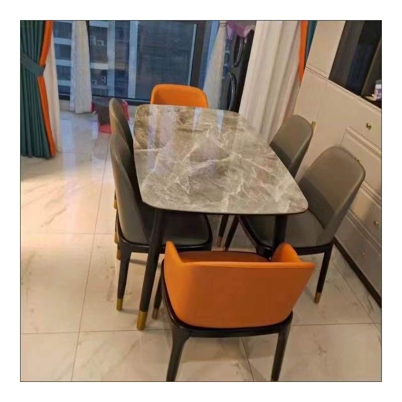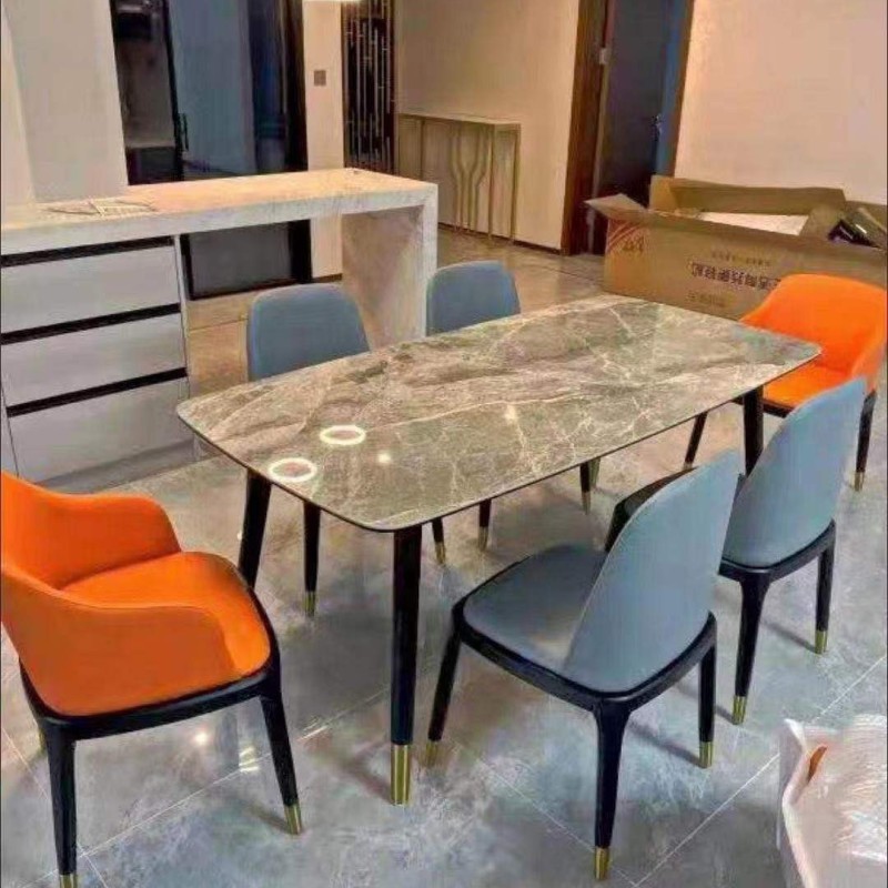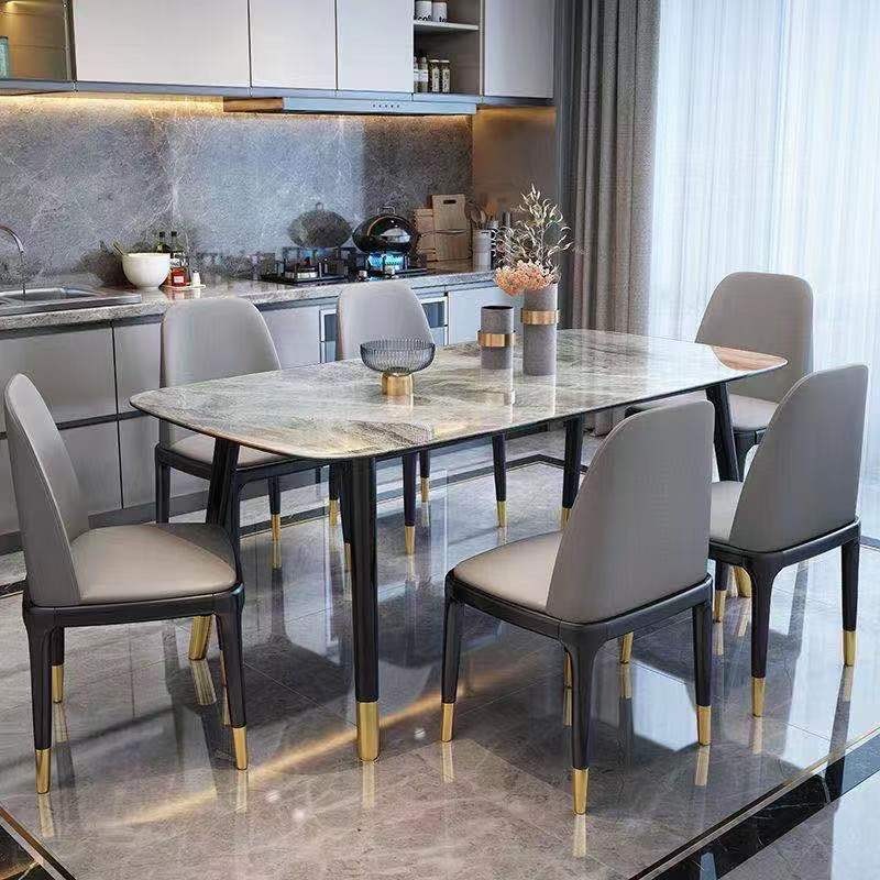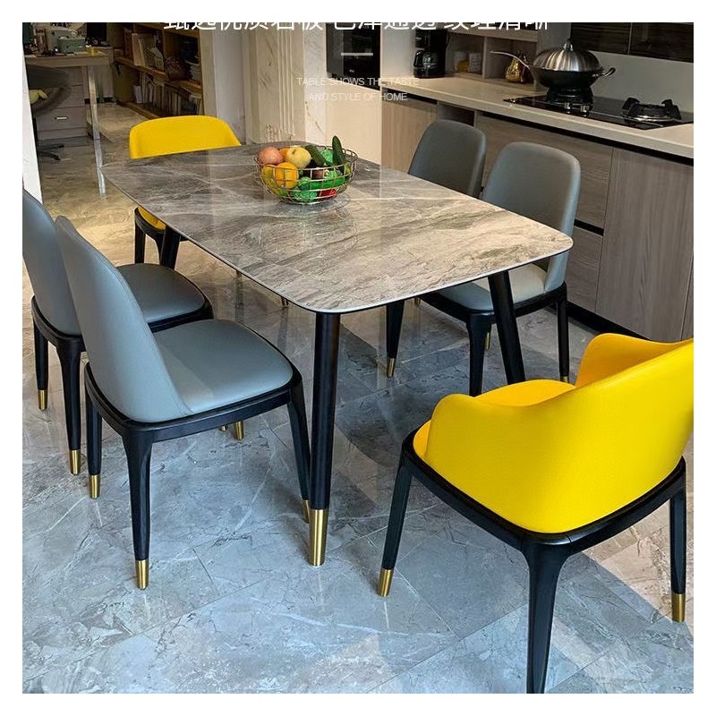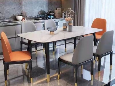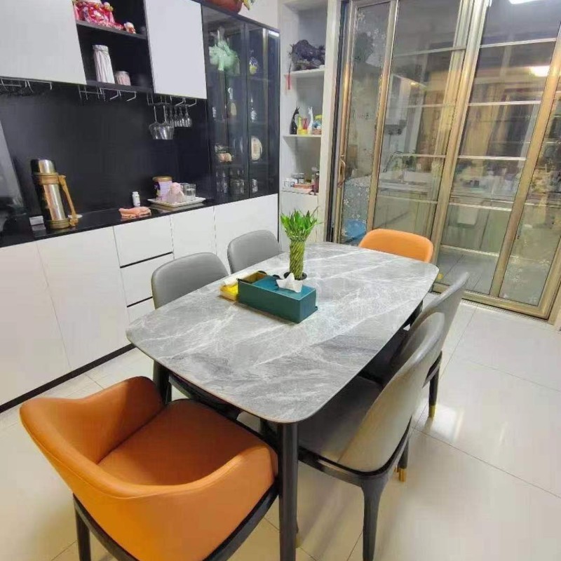 全橡木圆脚方桌,搭配全实木八角椅,台架带板,台面:意大利灰亮光岩板,雪山白亮光白岩板