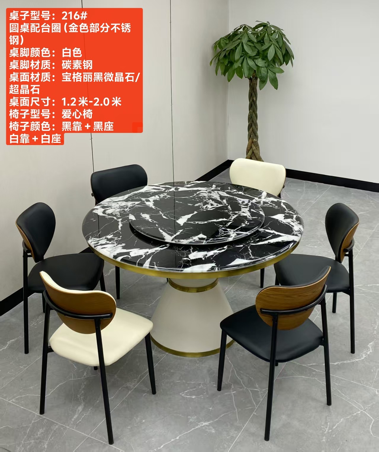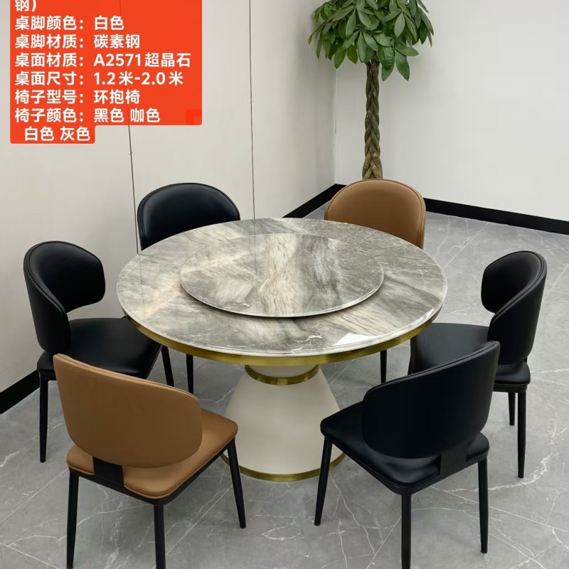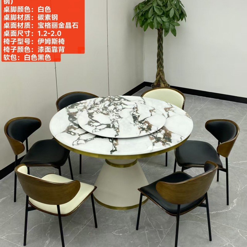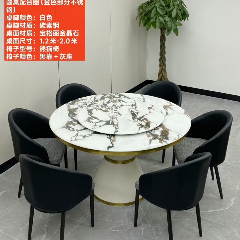 型号:216# 不锈钢款 圆桌配配台圈 材质:碳素钢底架(金色部分不锈钢) 搭配岩板/微晶石/超晶石 尺寸:1.2米-2.0米 搭配熊猫椅,环抱椅,百雀椅, 大菠萝,贝勒椅,刀片椅,蝴蝶椅 羊角椅 太阳椅 爱心椅 随意搭配