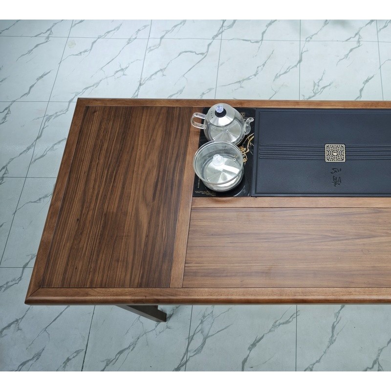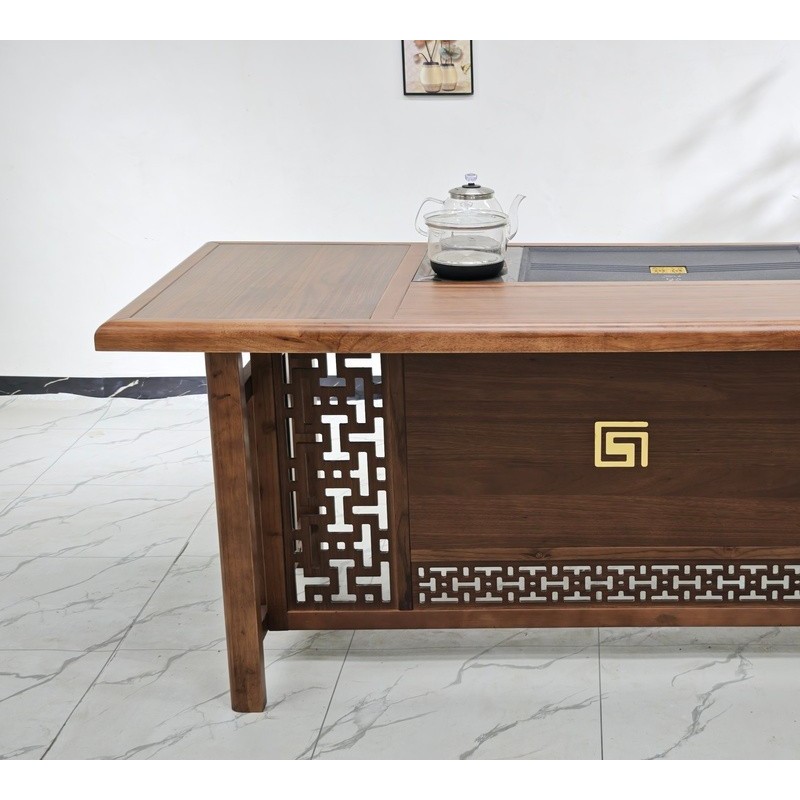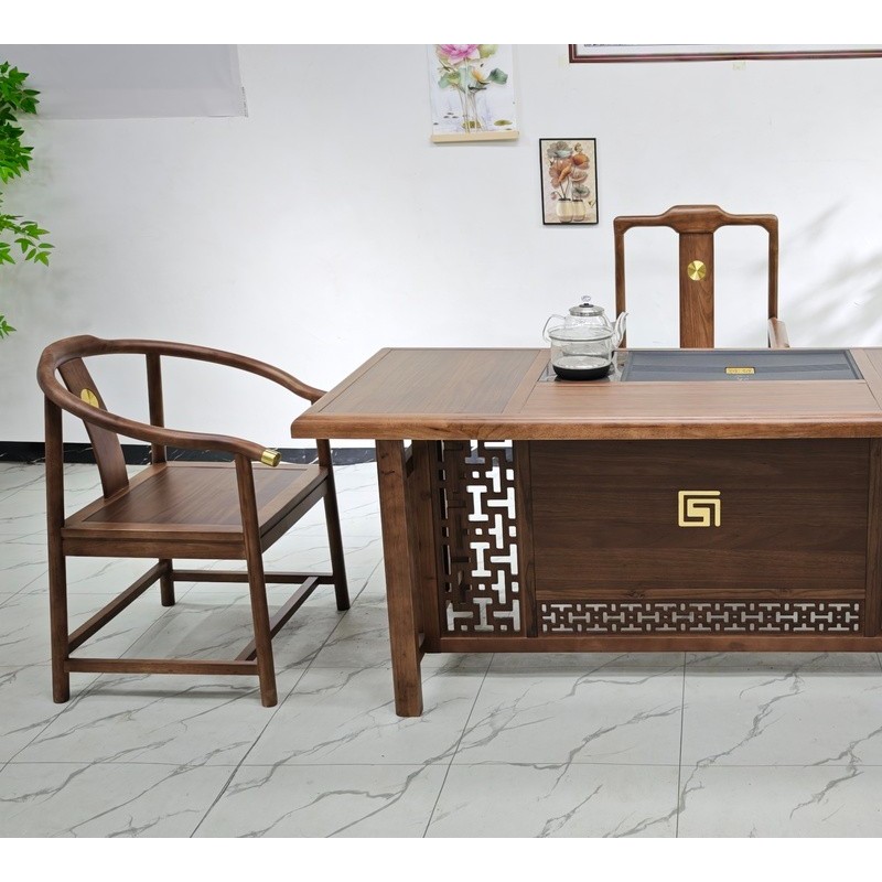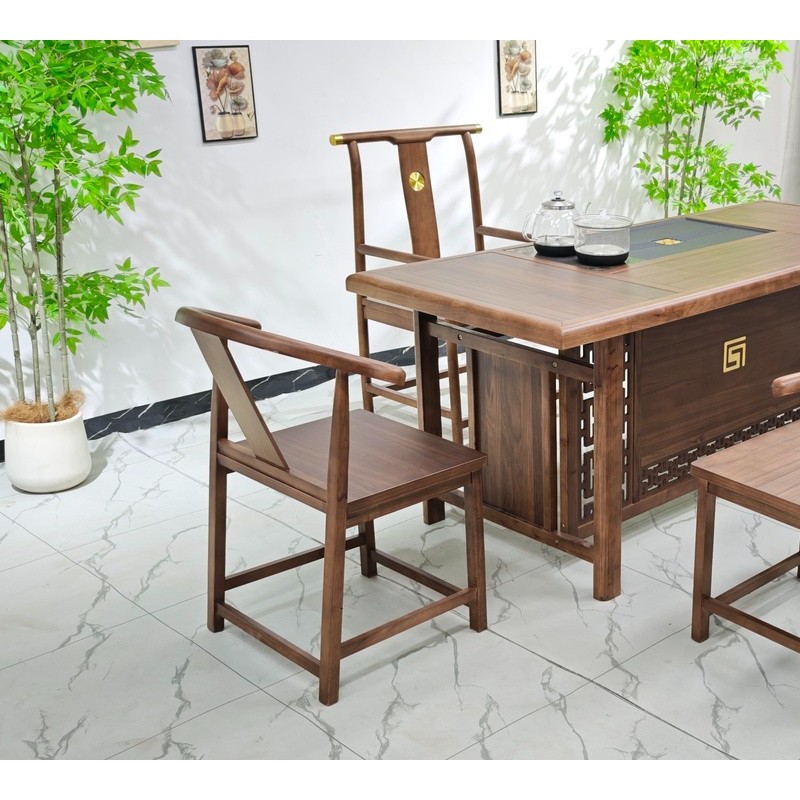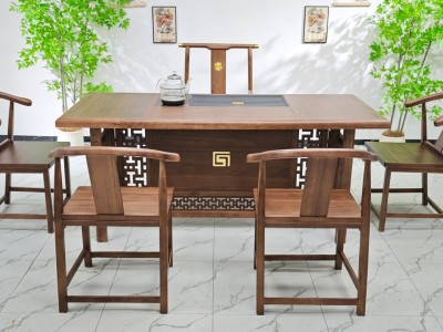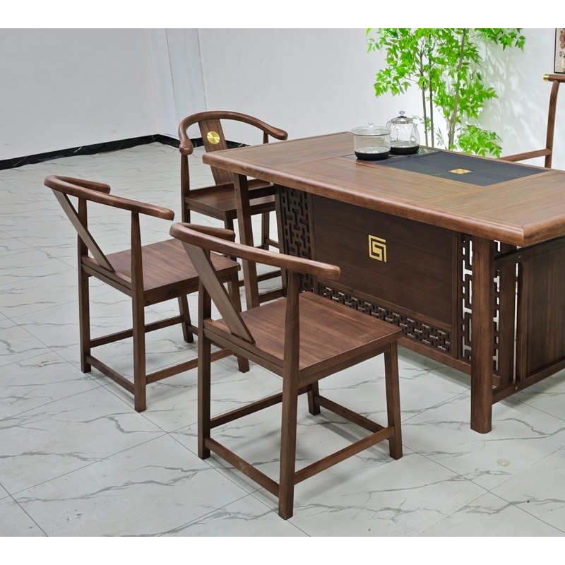 茶台,实木茶台,和韵茶台中配(新款) 【尺寸】160/180*80*73CM 【配置】1中圆主椅+4小围椅带养生炉 【材质】橡木➕乌金木工艺 【颜色】北美胡桃色