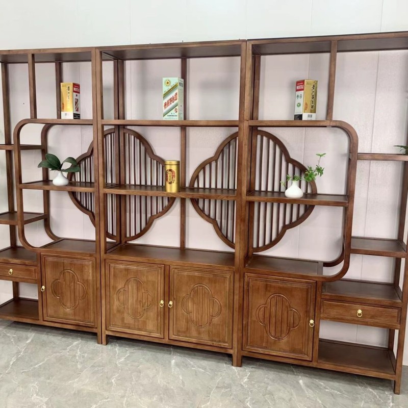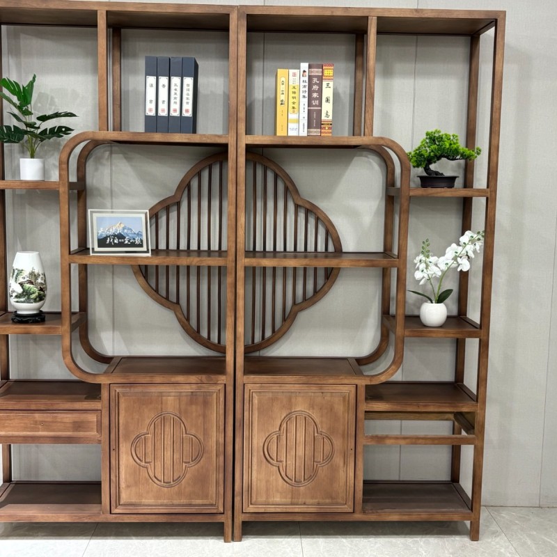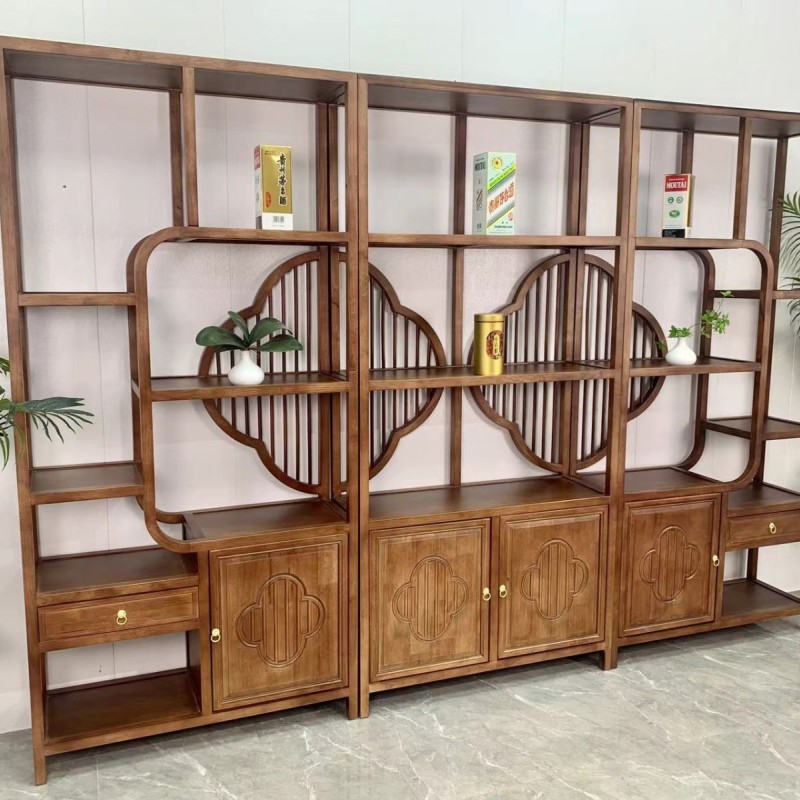 梅花博古架 【尺寸】285×33×196CM(三组合) 95×33×196CM(中柜) 192×33×196CM (两组合) 【材质】橡木/格木 【颜色】北美胡/黑胡桃