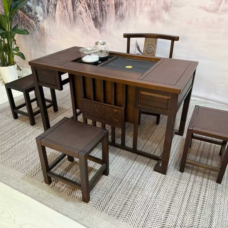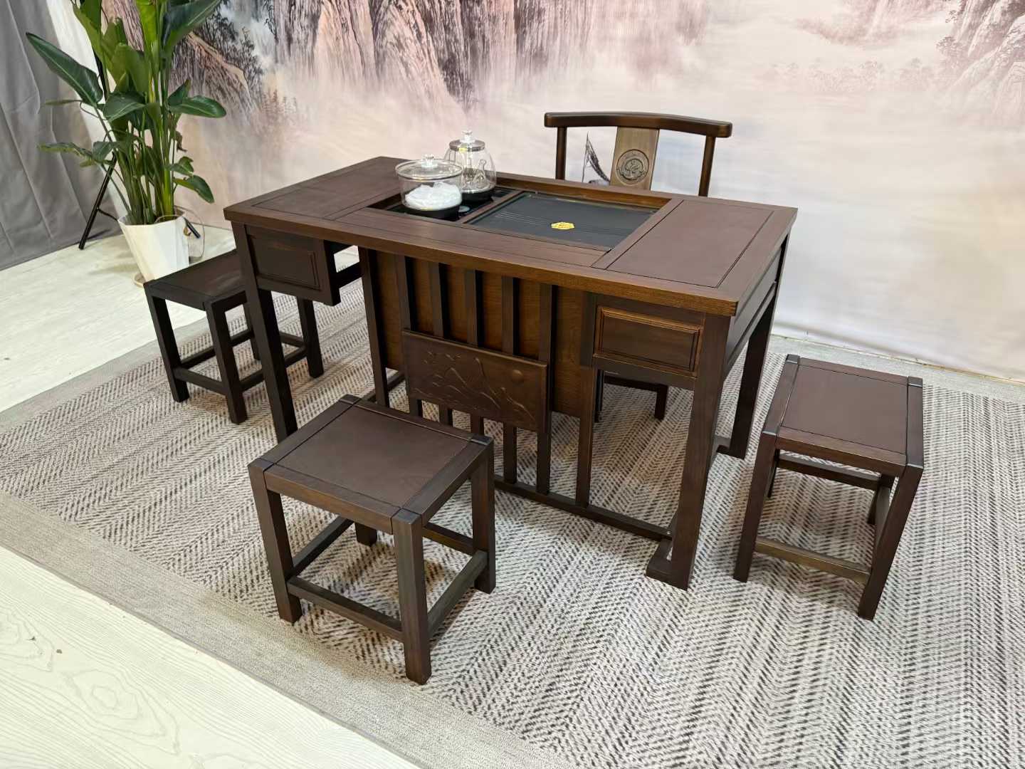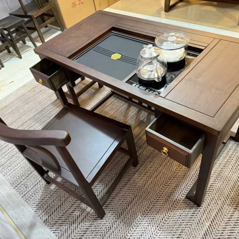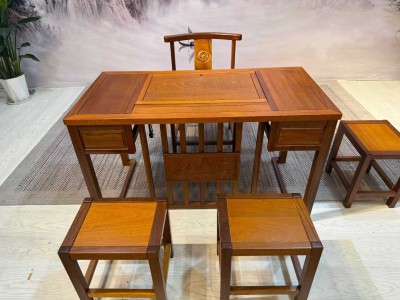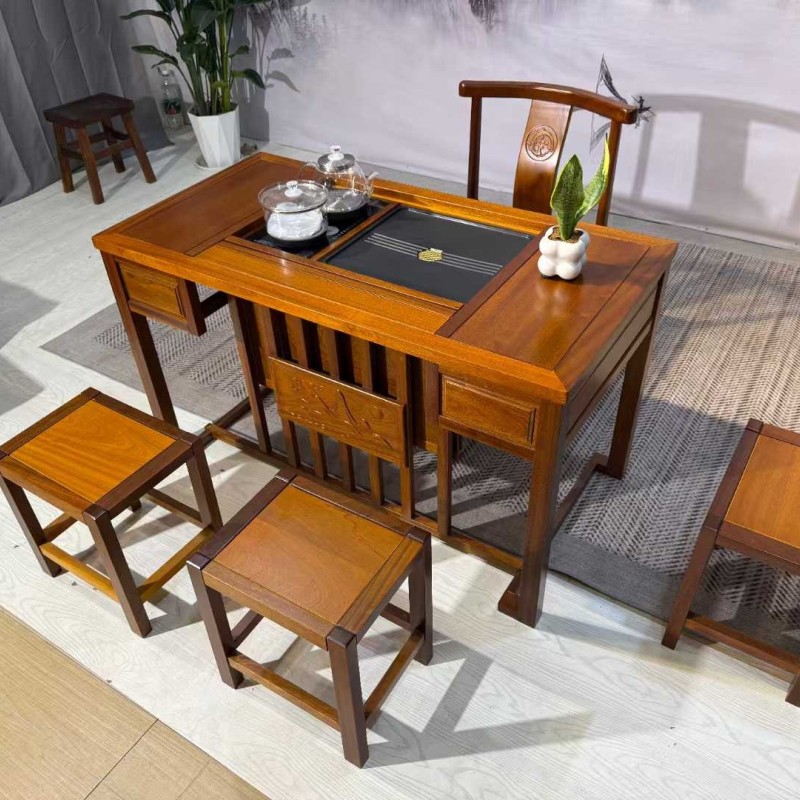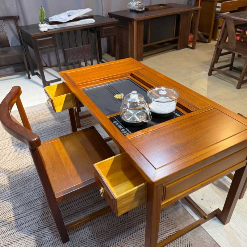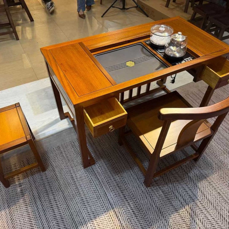 详细信息IP属地 江西赣州 F18#多功能茶台 材质:沙比利材质/刚果花梨木 颜色:北美色/花梨色 规格:120*65*70 配置:一桌四椅+玻璃养生壶 带盖板,双抽屉,超实用,高级色 泡茶桌,办公桌,娱乐桌,餐桌,一桌多用