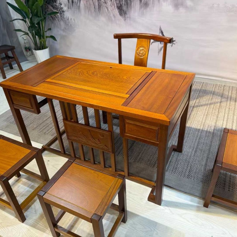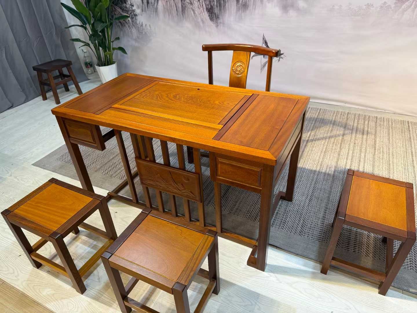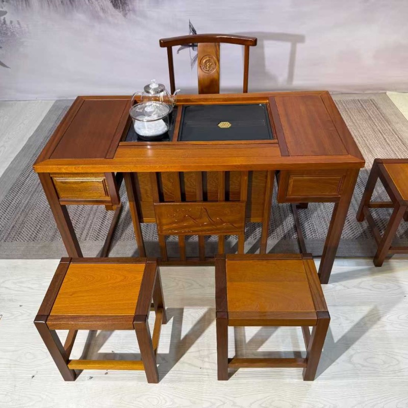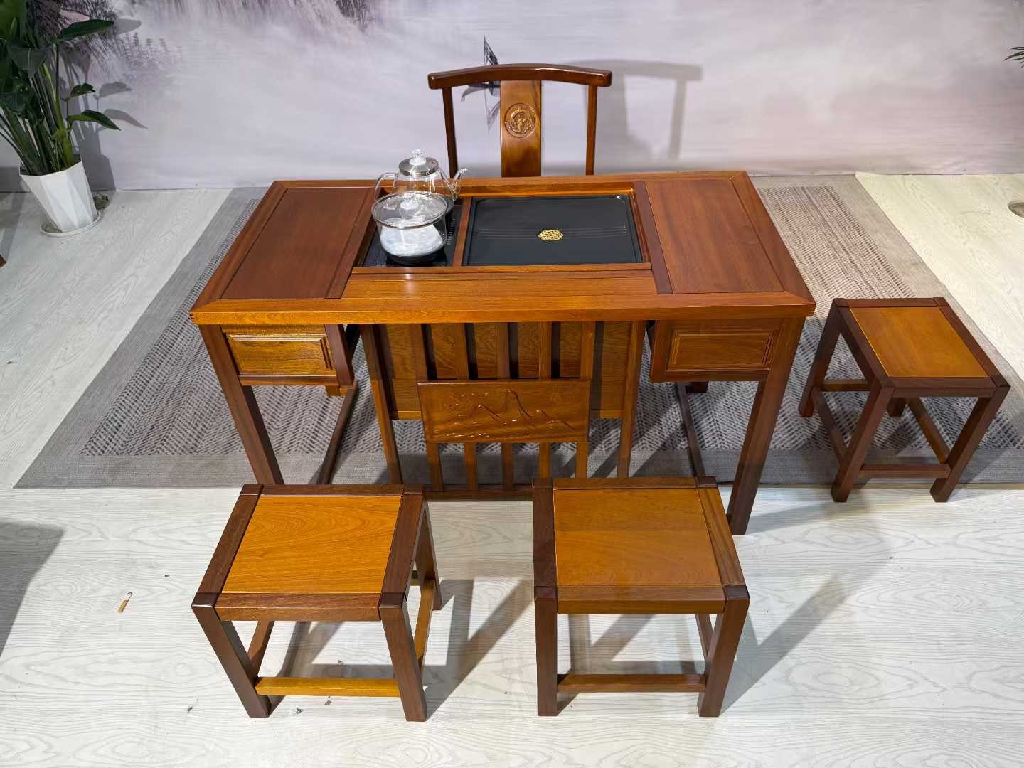 首页 > 产品中心 > F18#多功能茶台 材质:沙比利材质/刚果花梨木 颜色:北美色/花梨色 规格:120*65*70 配置:一桌四椅+玻璃养生壶 带盖板,双抽屉,超实用,高级色 泡茶桌,办公桌,娱乐桌,餐桌,一桌多用
