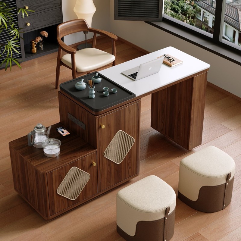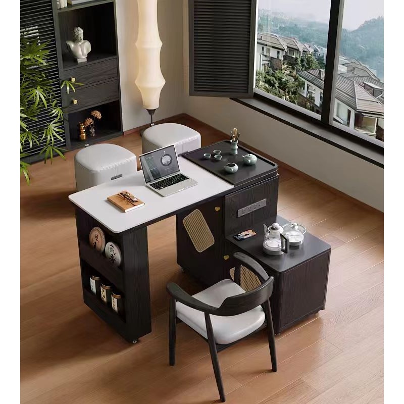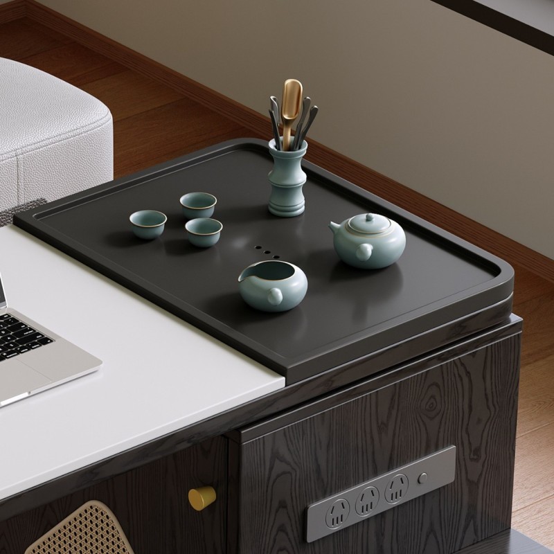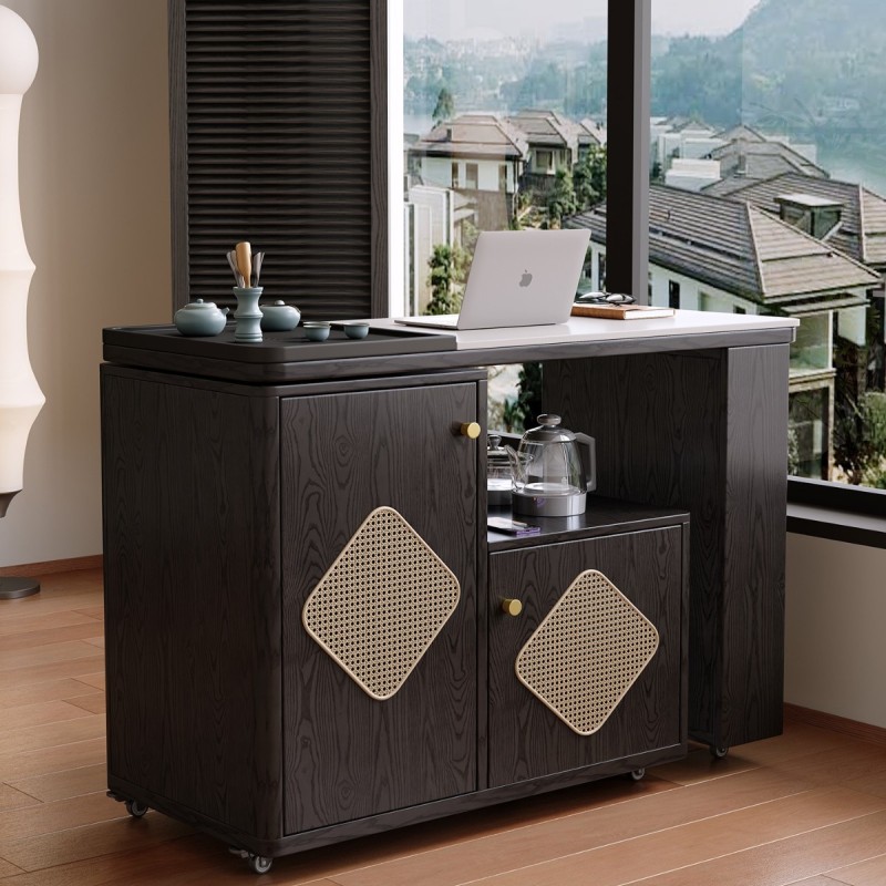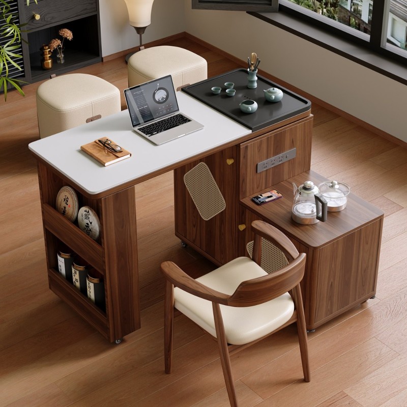 观山茶台 材料: 生态实木 台面: 乌金石+岩板 可旋转/折叠/伸缩/移动 四合一多用途