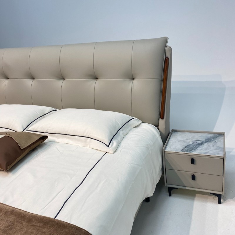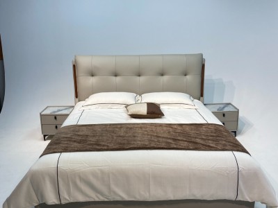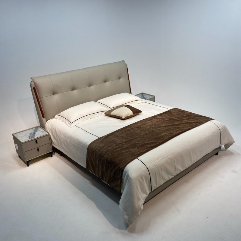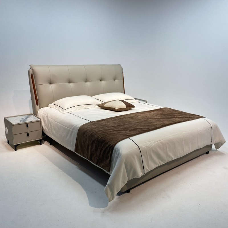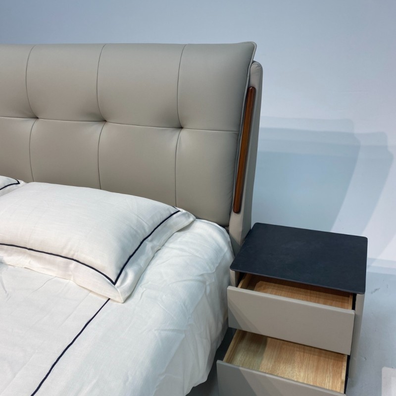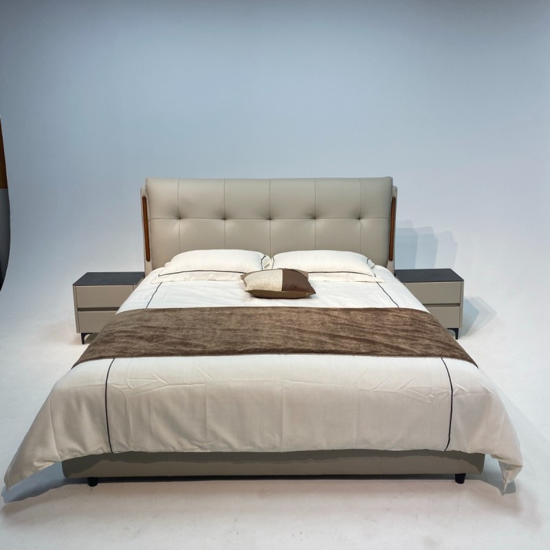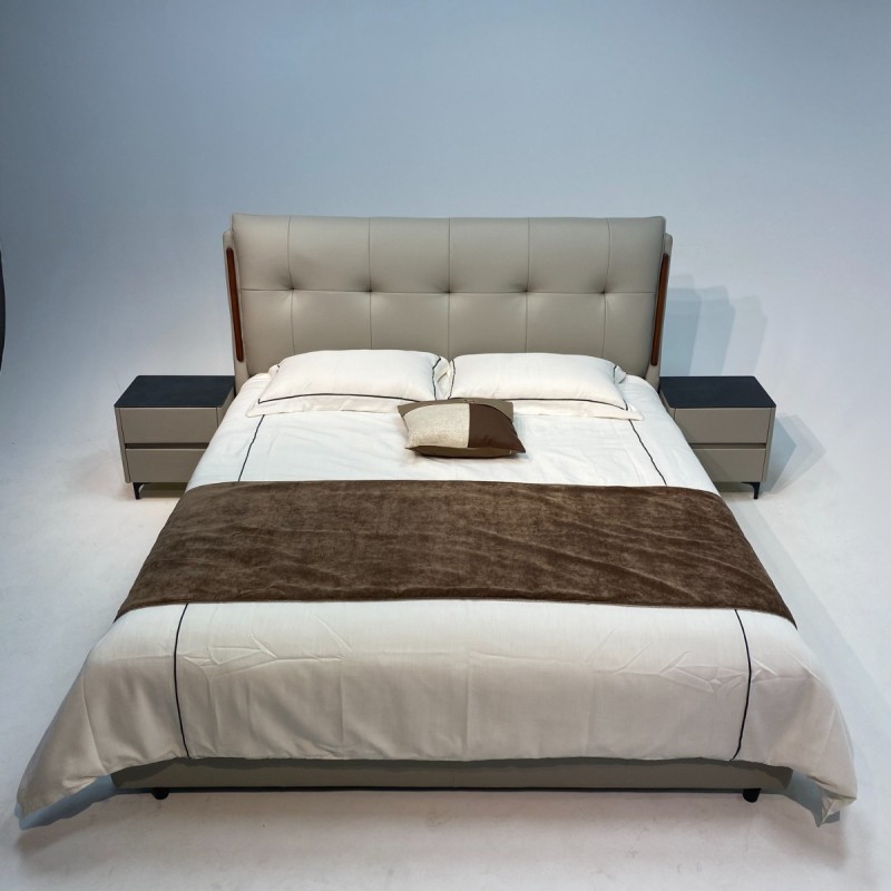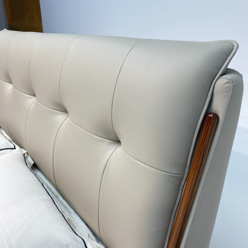 129# (红木条) 面料:生态皮 两个颜色:米灰色034-3 4公分燕尾榫橡胶木床边,三大块-2公分满铺橡胶木床板
