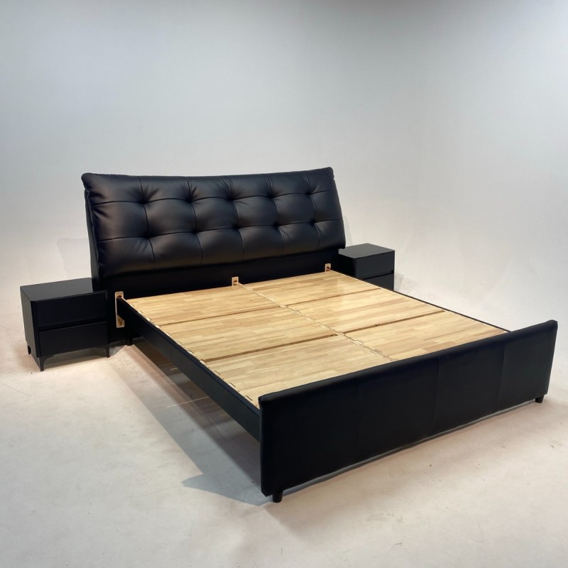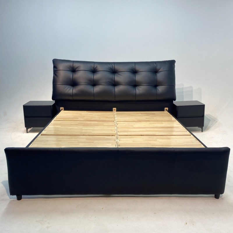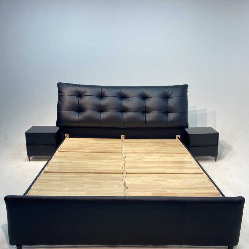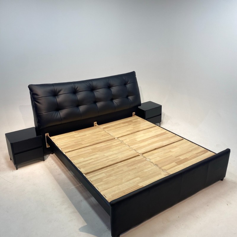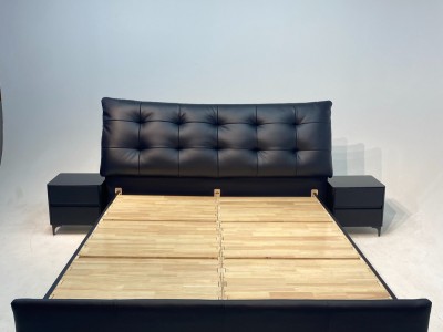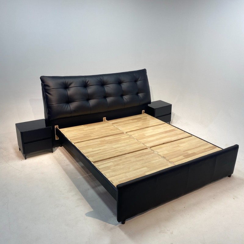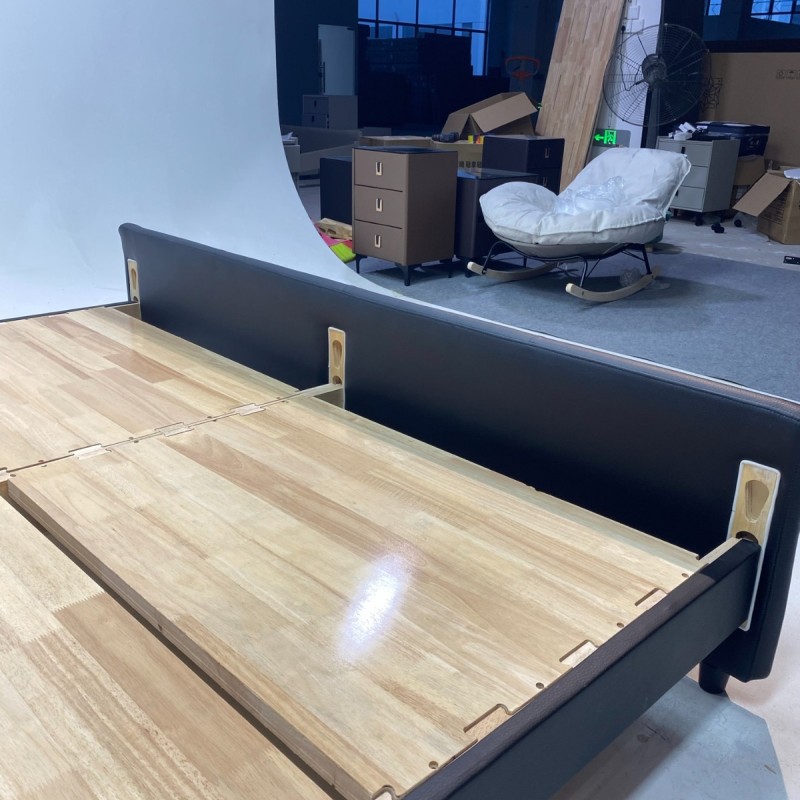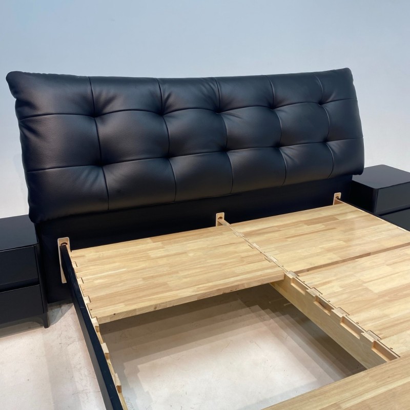首页 > 产品中心 > 床头、床尾三个榫卯卡槽孔位,可调节 型号:805# 面料:生态真皮 颜色:黑色 4公分燕尾榫橡胶木床边,6块-2.8公分橡胶木床板 双燕尾橡胶木龙骨,可调节高低,同时适配薄床垫10cm-厚床垫20cm