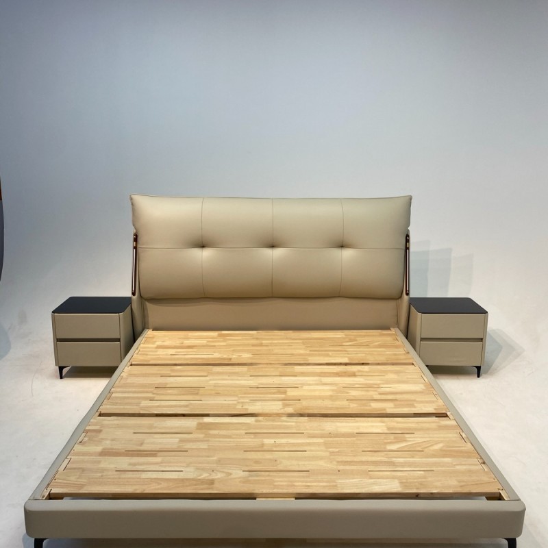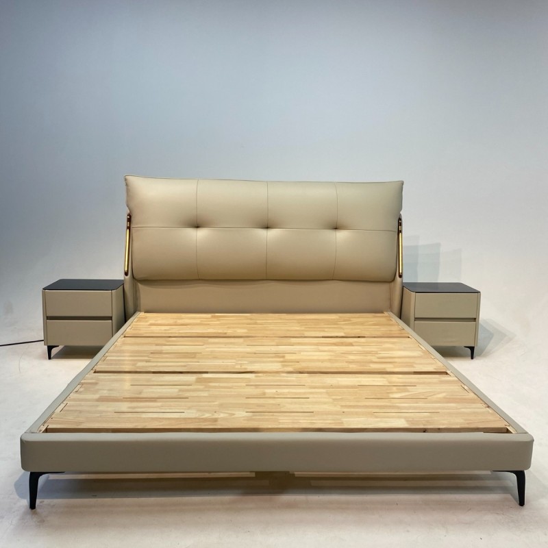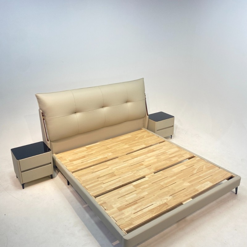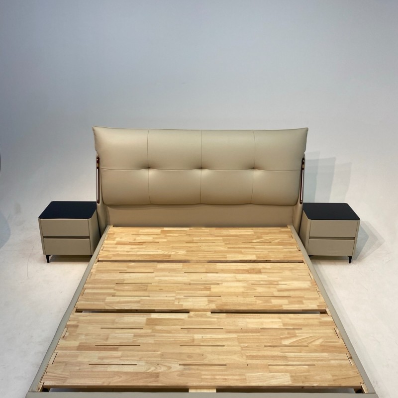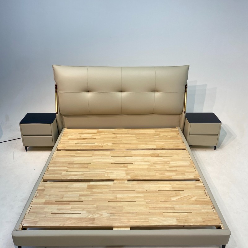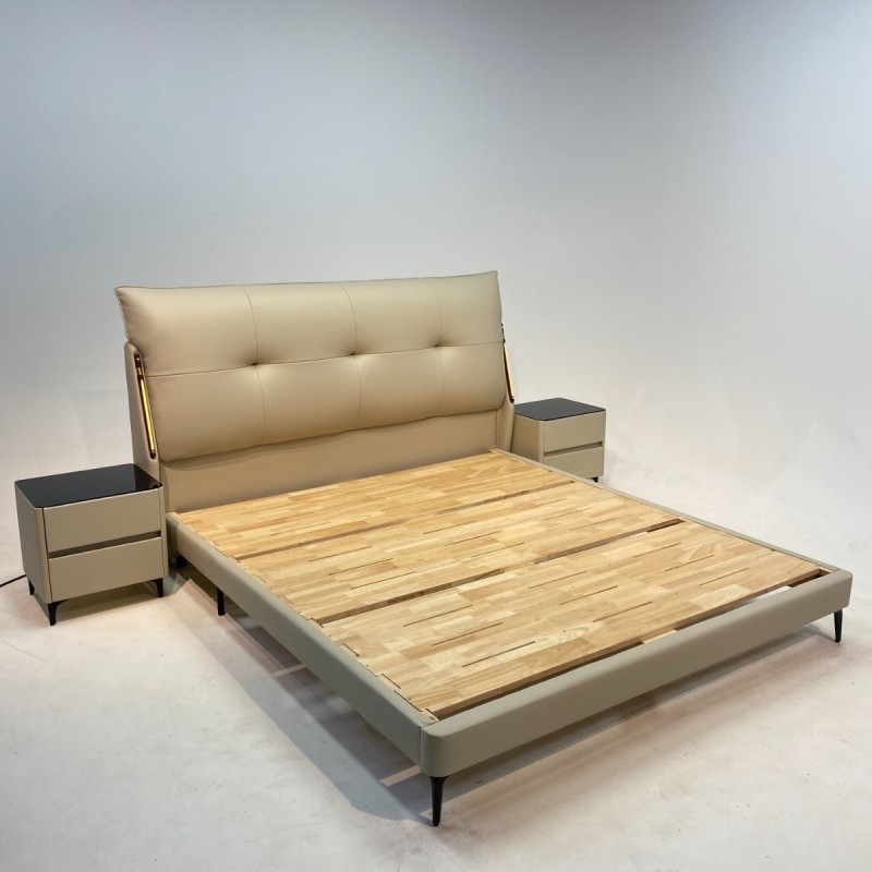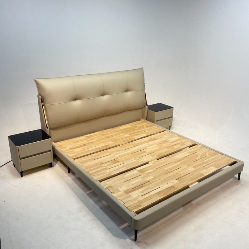 815#带灯 面料:生态真皮 颜色:珠白N-2 6×11公分全实木燕尾榫橡胶木床边,2公分厚,三大块满铺橡胶木床板 配轻奢玻璃柜(可换岩板)