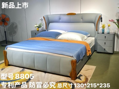 8805新品上市(专利产品) 【颜色】灰色,可定制各种颜色 【面料】正版生态真皮 【配置】松木床板3x15超静音 床边加宽加固耐用 【外框】130*215*235 【特点】床头床尾两侧带乌金木、海棉靠包秒回弹永不变形,床头加厚舒适又柔软,床头柜升级黑金钛化玻璃三个抽屉,非常显高端大气、整体效果非常上档次,也是市场差异化设计,经典百搭款,值得上样!