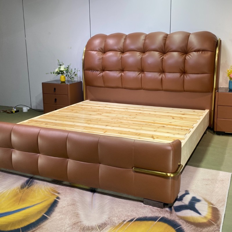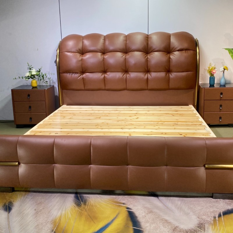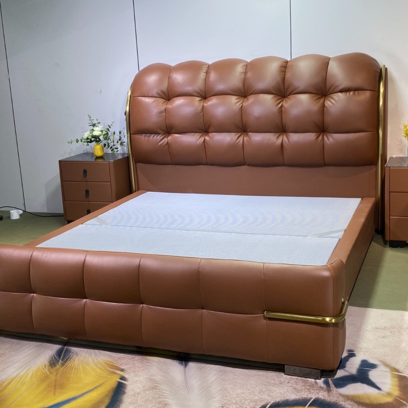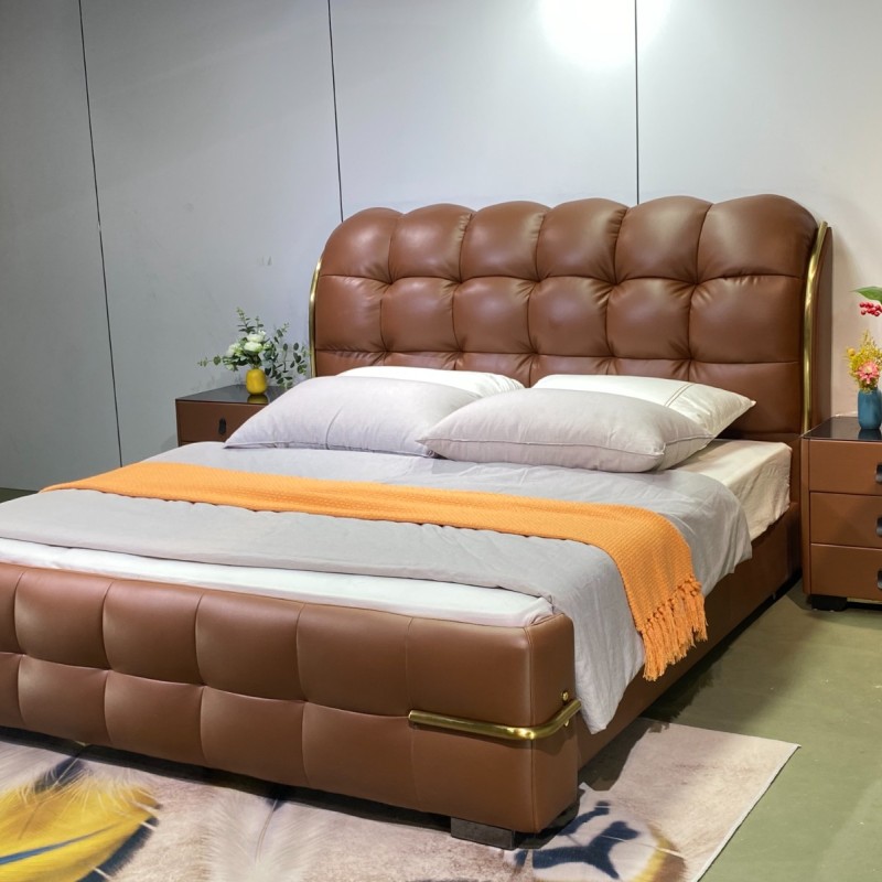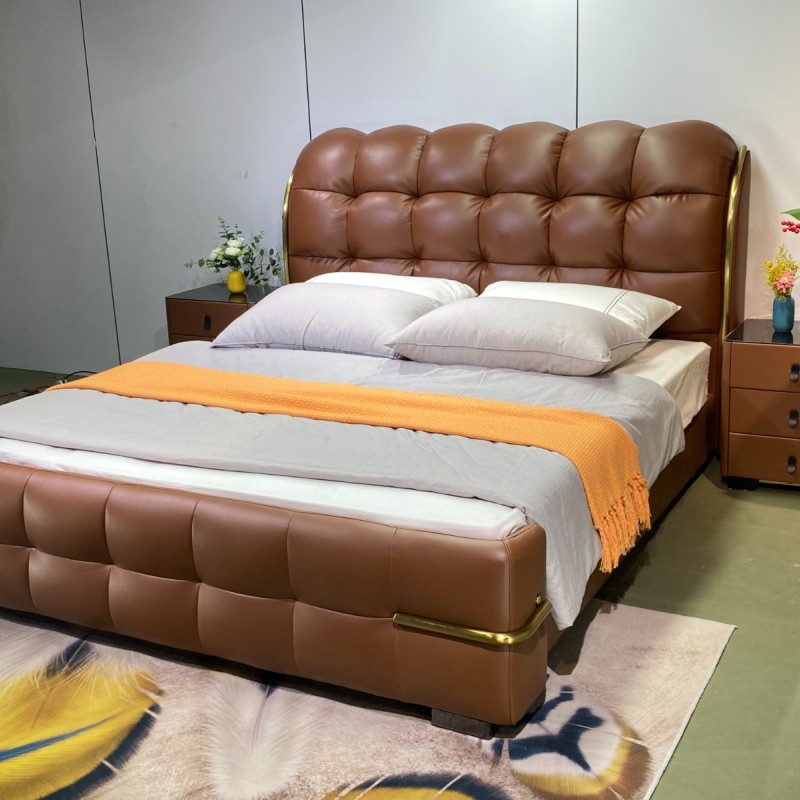 8816新品上市(专利产品) 【颜色]爱玛仕橙 【面料】正版生态真皮 【配置】6D松木床板,松木床边4公分满铺床板,超静音 床边加宽加固 耐用承受力强 【外框】长230.宽195高125 【特点】床头床尾两侧带镀钛金属装饰,靠包高密度回弹海绵,秒回弹,永不变形,床头拉扣设计,面料舒适有质感,床头柜升级黑金钛化玻璃三个抽屉,非常显高端大气、整体效果非常上档次,也是市场差异化设计,经典百搭款,值得上样大卖!