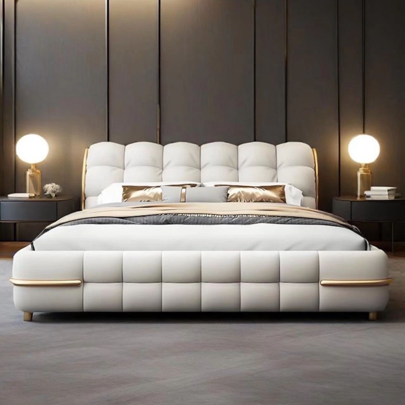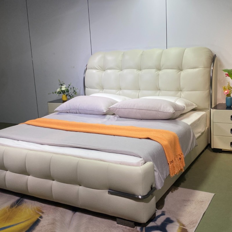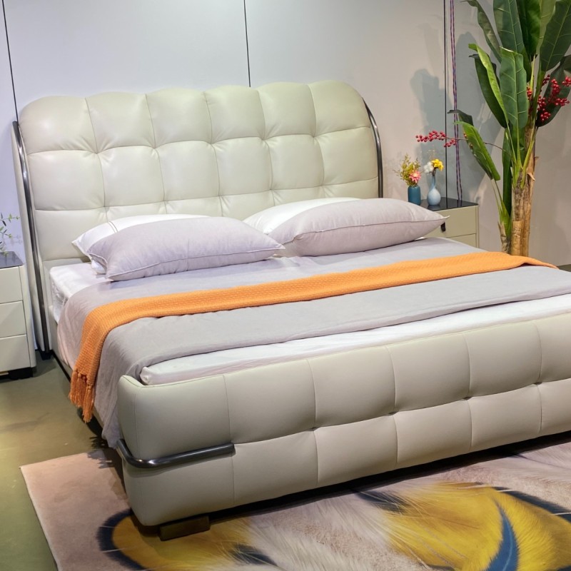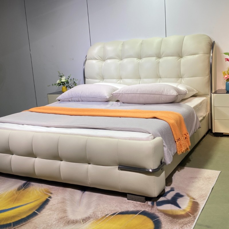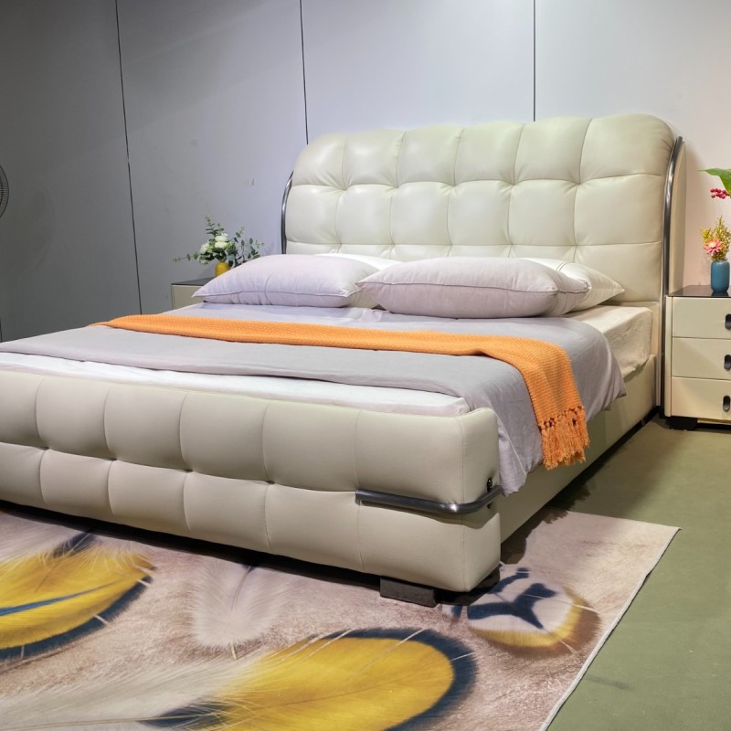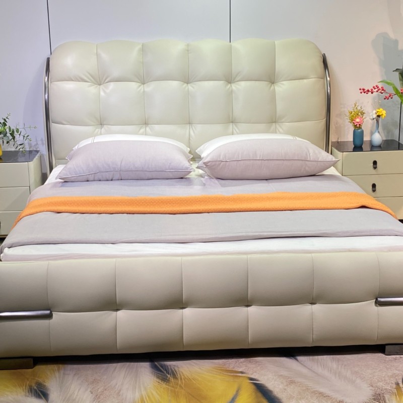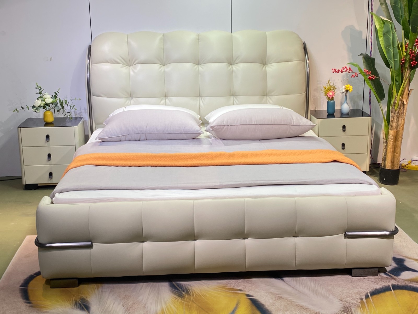 详细信息IP属地 江西赣州 8816# 米白色,新品上市(专利产品) 【颜色]珠光米白色 【面料】正版生态真皮 【配置】床边板木结合,加宽加固,床板松木3x15. 超静音,耐用承受非常强,使用寿命长 【外框】长230.宽195高125 【特点】床头床尾两侧带镀钛金属装饰,靠包高密度回弹海绵,秒回弹,永不变形,床头拉扣设计,面料舒适有质感,床头柜升级黑金钛化玻璃三个抽屉,非常显高端大气、整体效果非常上档次,也是市场差异化设计,经典百搭款,值得上样大卖!