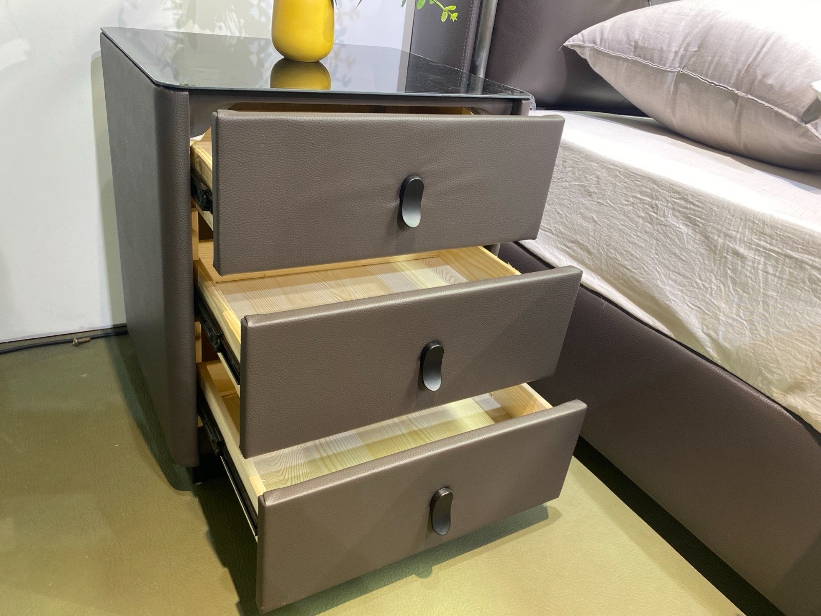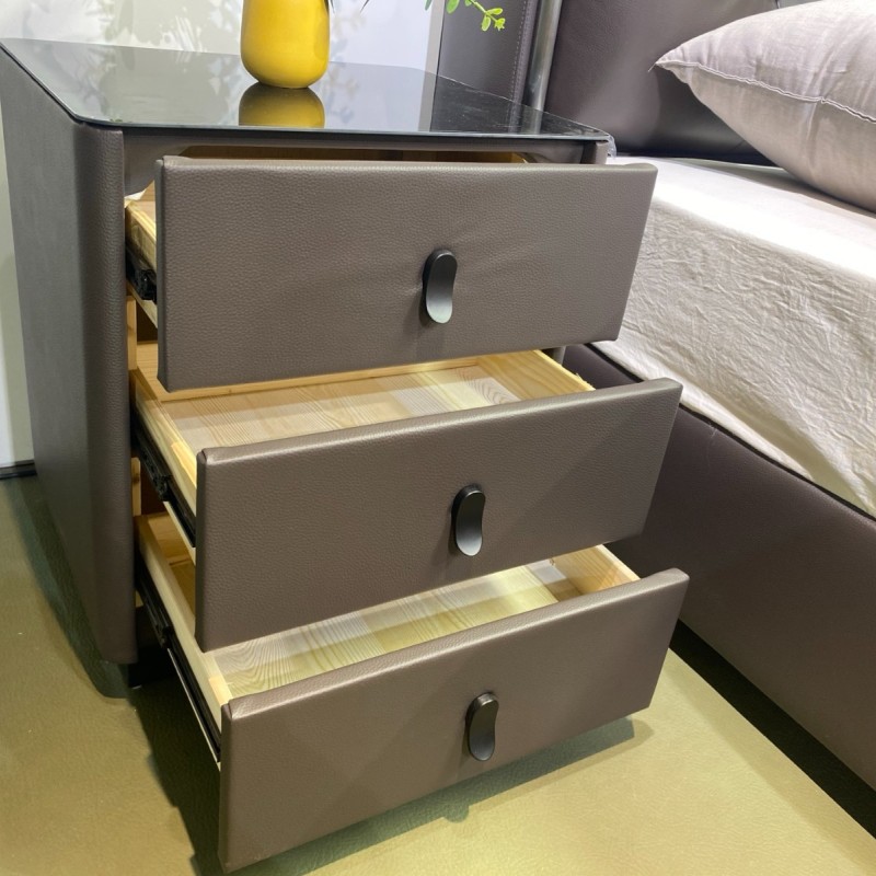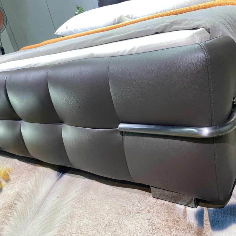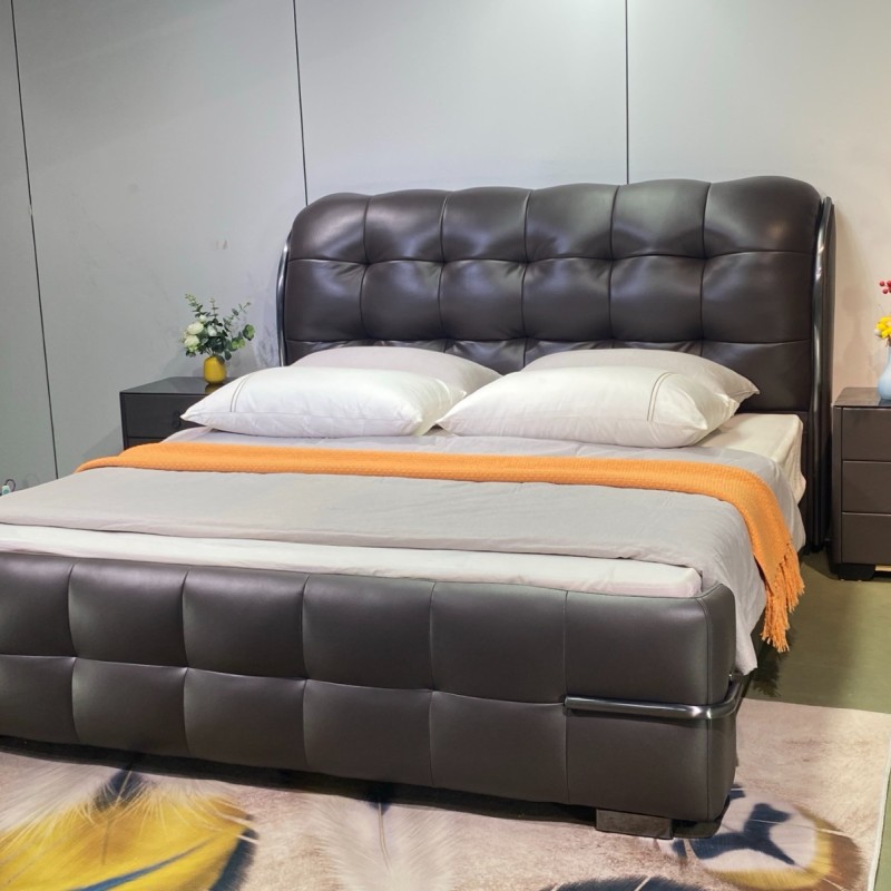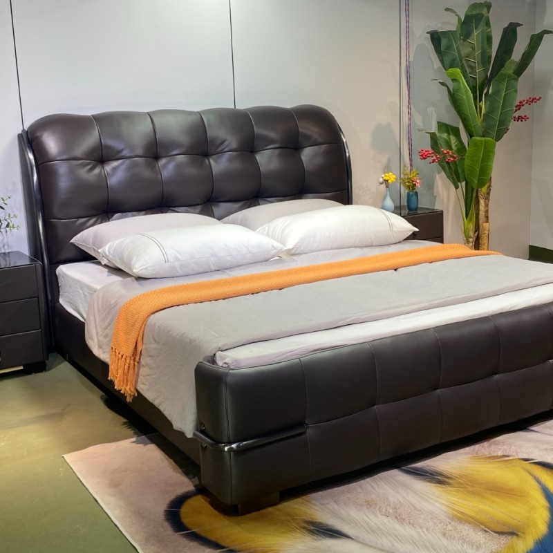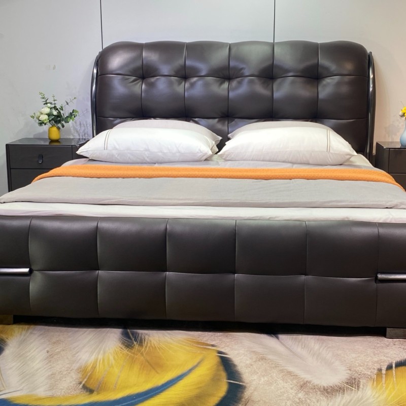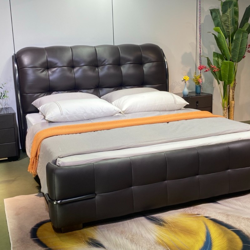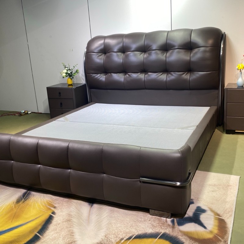 8816# 粽黑色,新品上市(专利产品) 【颜色]棕黑色 【面料】正版生态真皮 【配置】床边板木结合,加宽加固,床板松木3x15. 超静音,耐用承受非常强,使用寿命长 【外框】长230.宽195高125 【特点】床头床尾两侧带镀钛金属装饰,靠包高密度回弹海绵,秒回弹,永不变形,床头拉扣设计,面料舒适有质感,床头柜升级黑金钛化玻璃三个抽屉,非常显高端大气、整体效果非常上档次,也是市场差异化设计,经典百搭款,值得上样大卖!