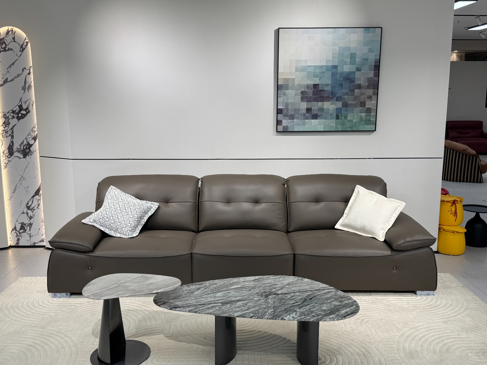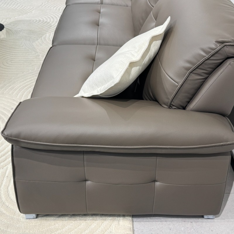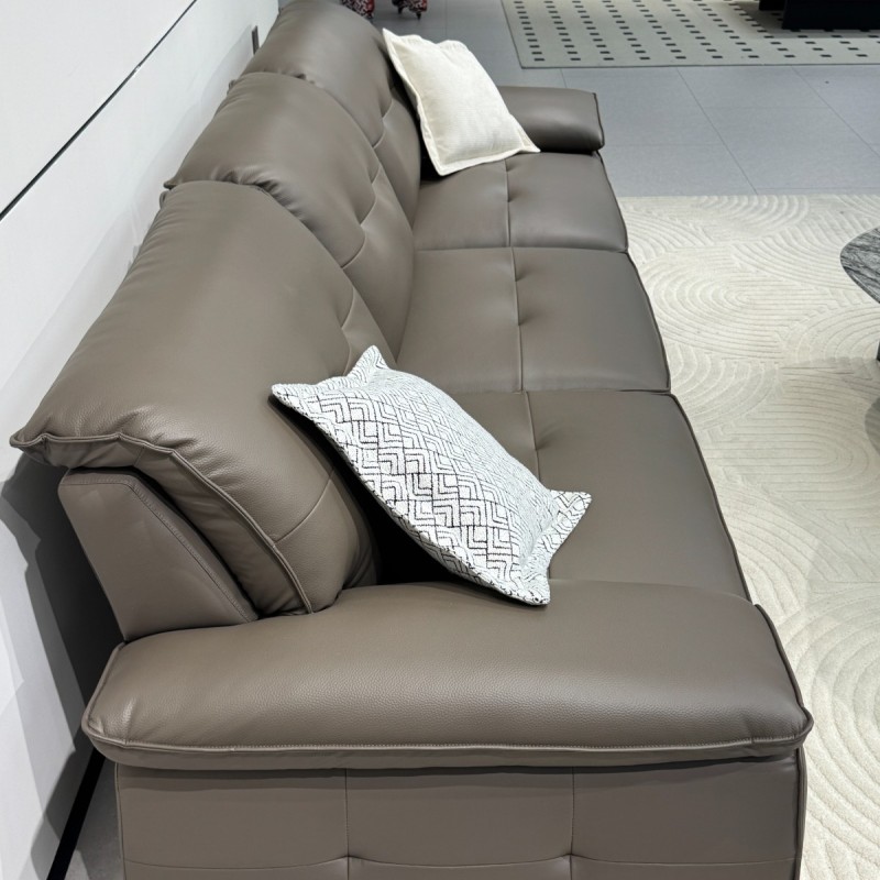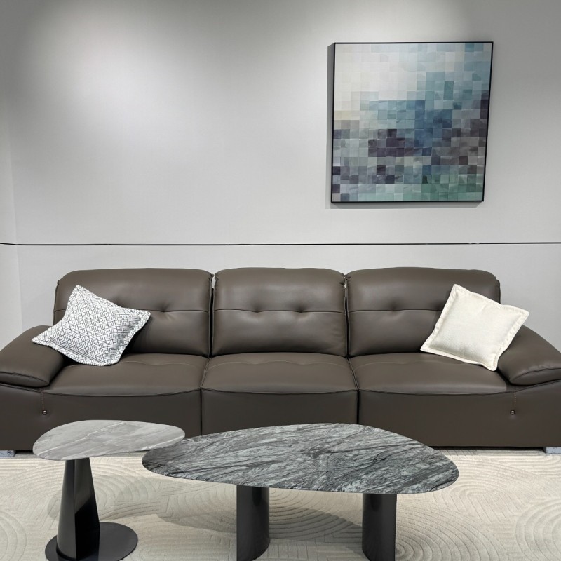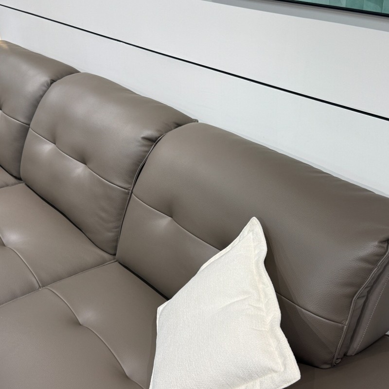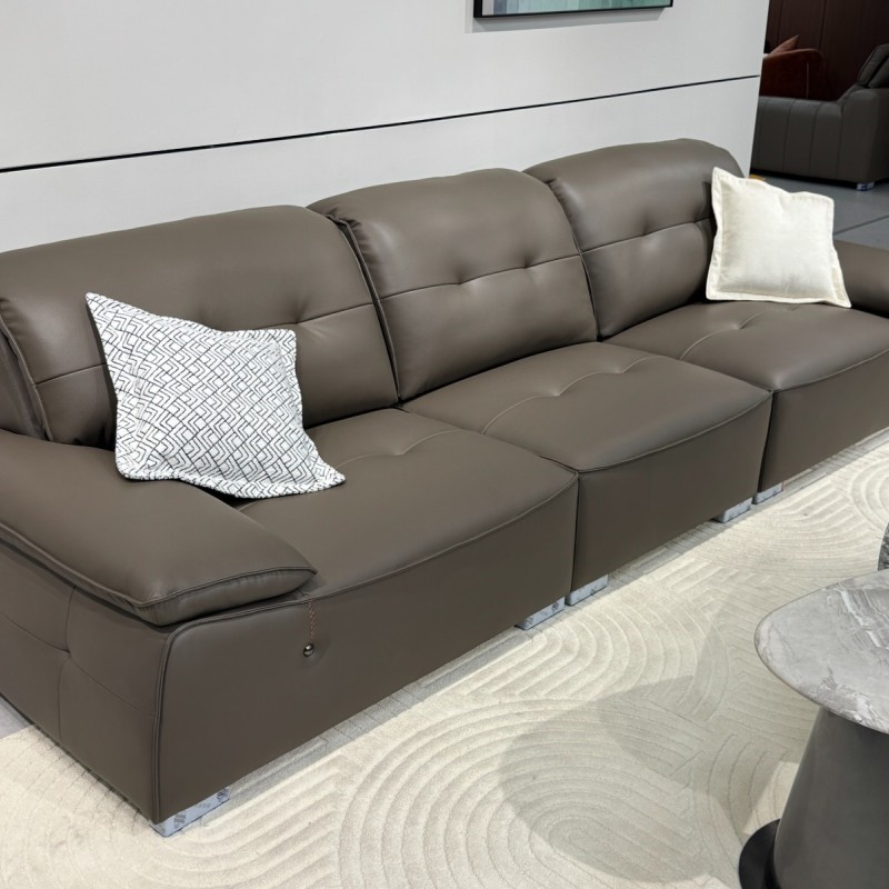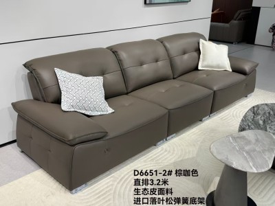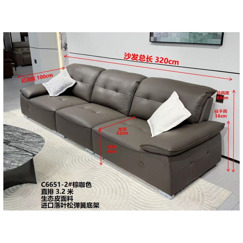 C6651-2# 棕咖色 尺寸:直排3.2米 特点:生态皮面料,实木宽板框架,羽绒靠包,海绵坐包,弹簧底架,高密度海绵,坐感舒适
