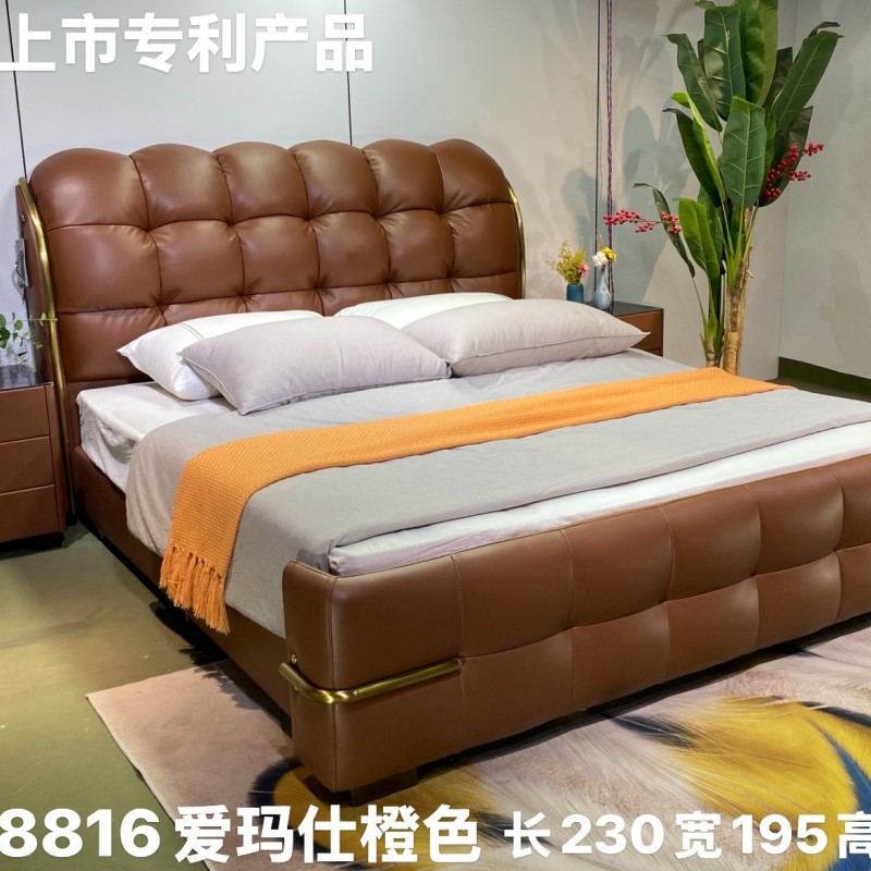 首页 > 产品中心 > 8816# 新品上市(专利产品) 一款四色可选【面料】正版生态真皮 【配置】床边板木结合,加宽加固,床板松木3x15. 超静音,耐用承受非常强,使用寿命长 【外框】长230.宽195高125