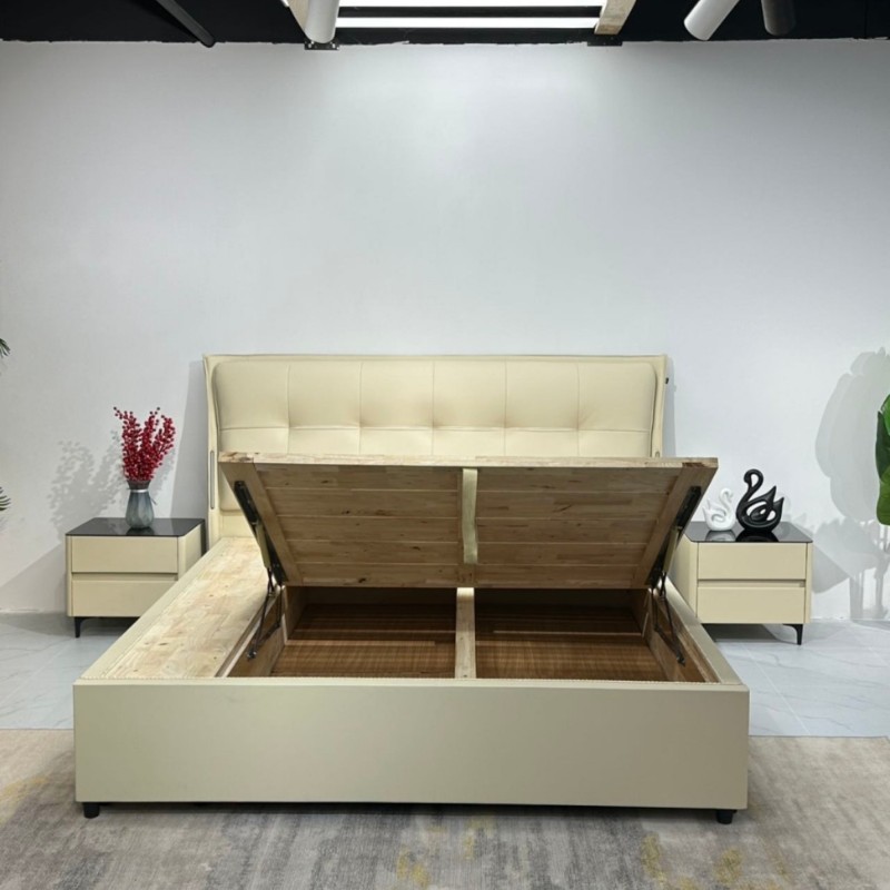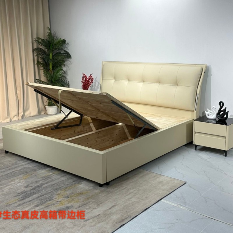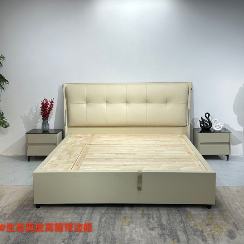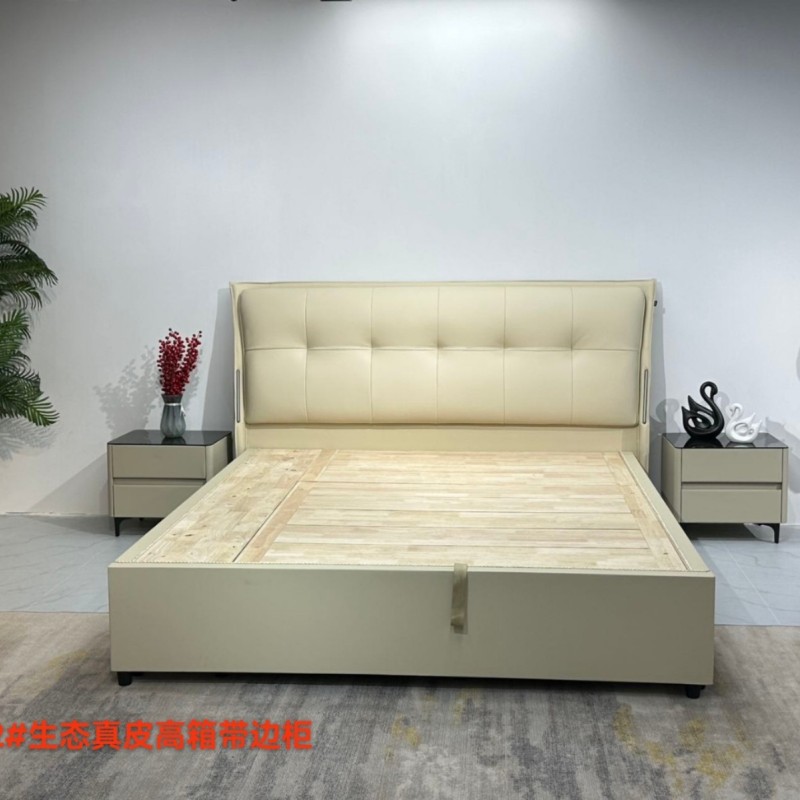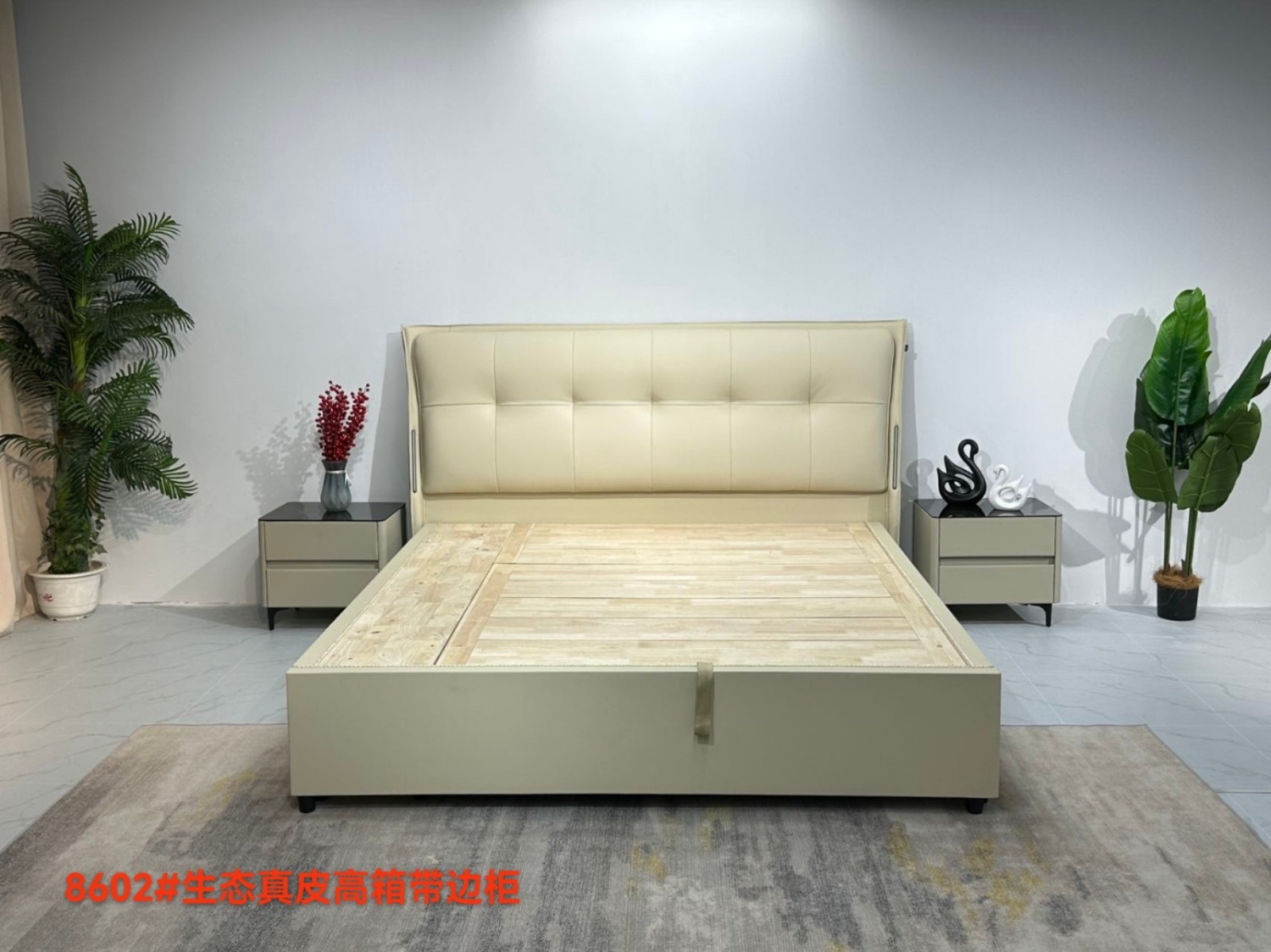 详细信息IP属地 江西赣州 高箱床系列 8602# W-29,生态真皮面料,时尚简约高密度海绵靠包, 全实木木超大容量储物大高箱,带两大抽边柜(可不带边柜), 橡木床板,带触摸灯,配时尚黑玻床头柜,1.8/1.5米。