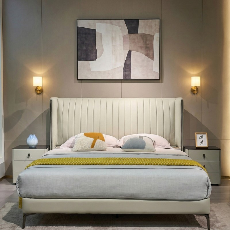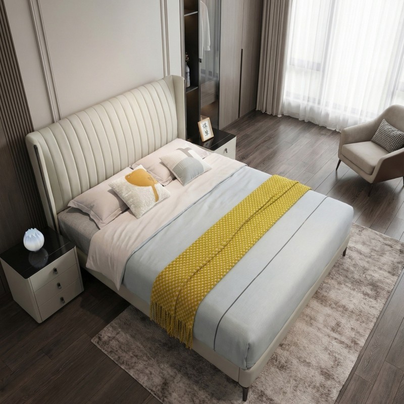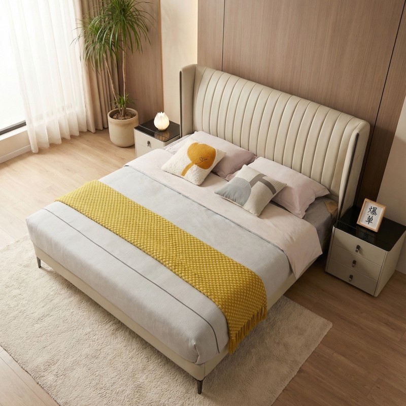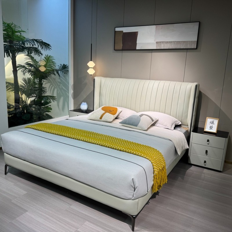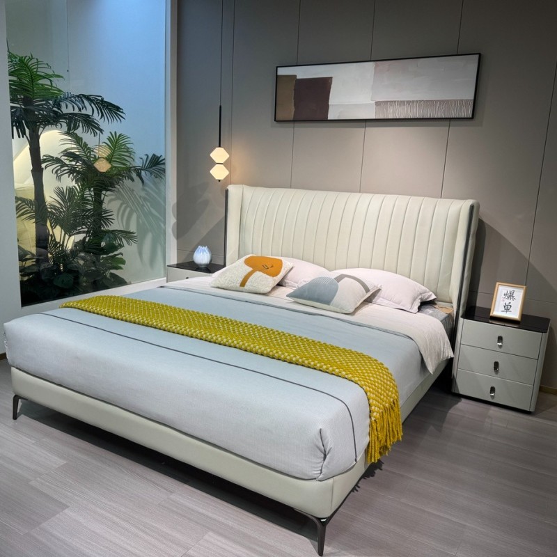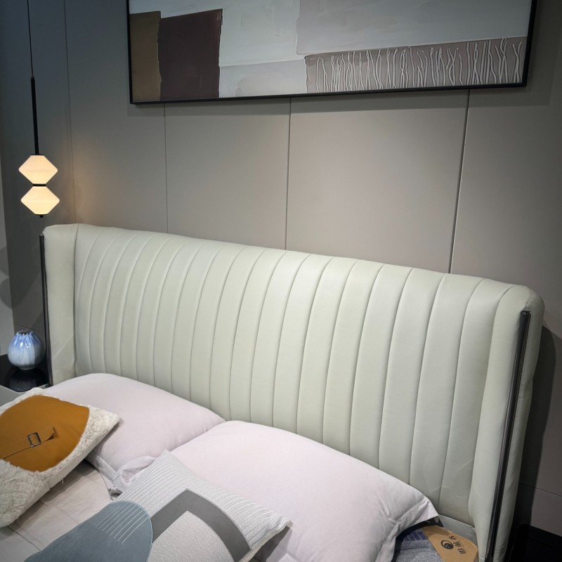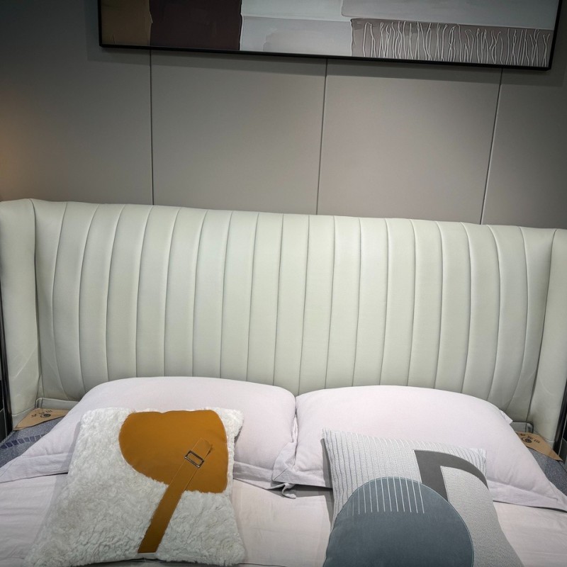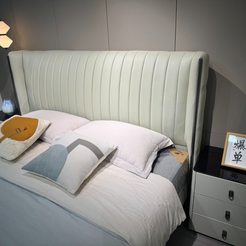 【型号】2603# 【面料】生态真皮 【填充】高密度海绵靠包 【配置】实木床边 2.5×20床板满铺 【特点】落叶松框架可透视+五金装饰