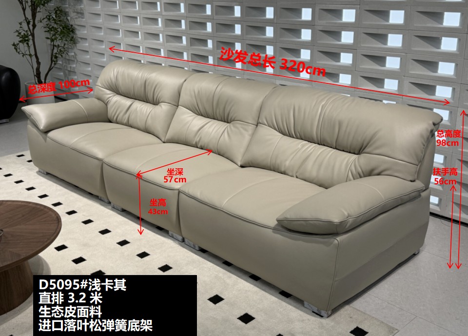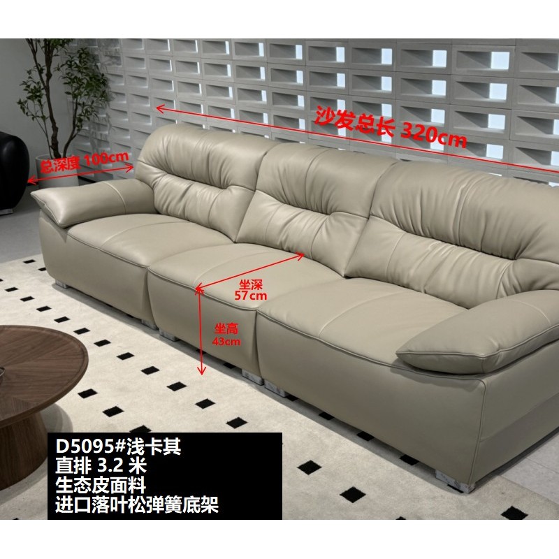 最高品质爆款新品上新 型号:D5095# 浅卡其 尺寸:直排3.2米 特点:生态皮面料,实木宽板框架,海绵坐包,弹簧底架,高密度海绵,坐感舒适!