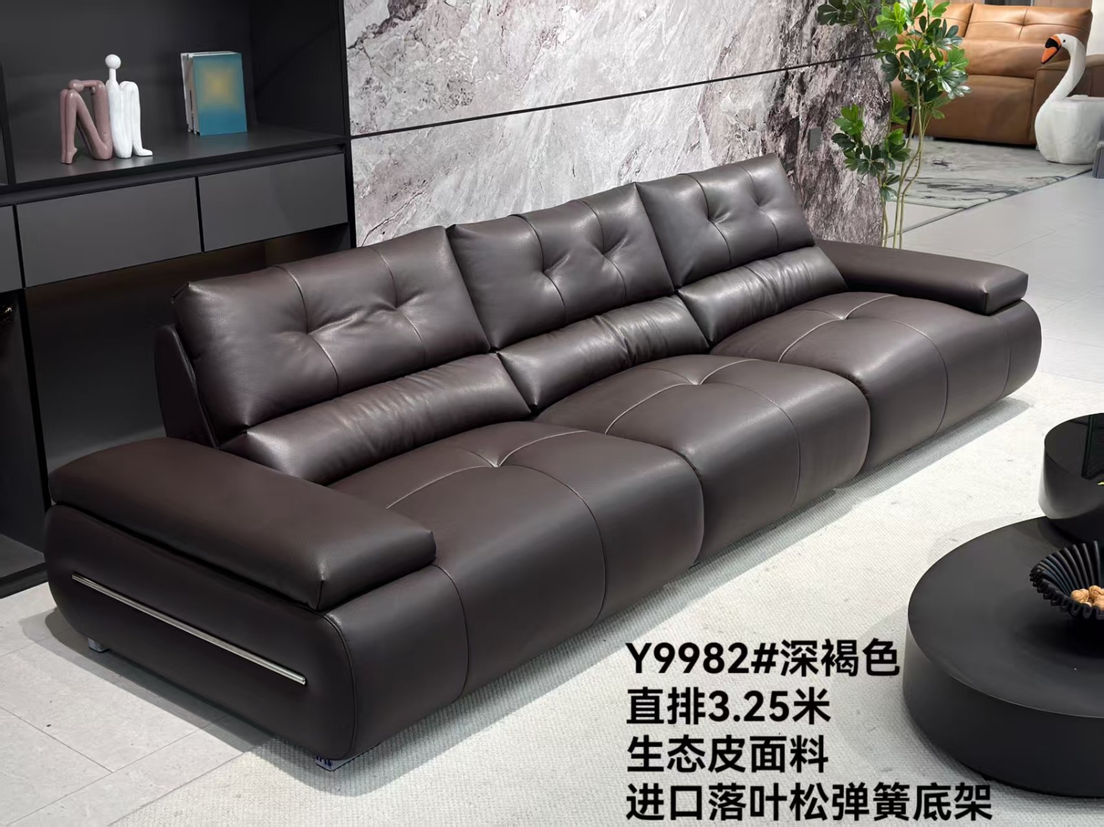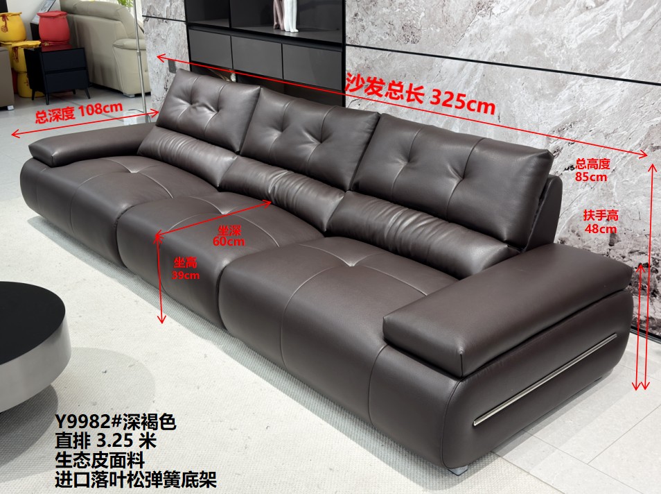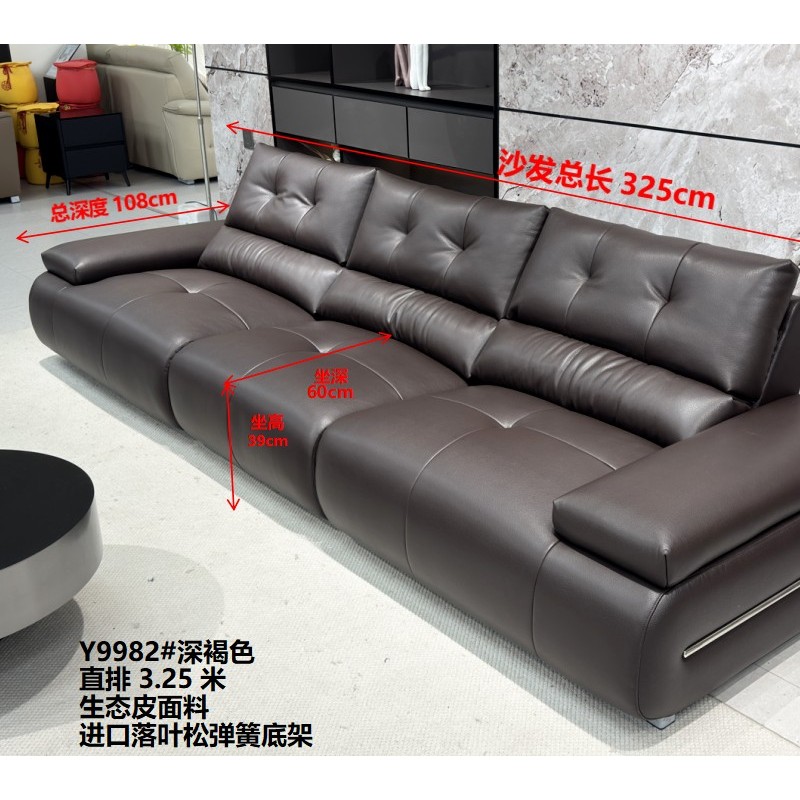 高品质爆款新品来袭 型号:Y9982# 深褐色 尺寸:直排3.25米 特点:生态皮面料,实木宽板框架,海绵坐包,弹簧底架,高密度海绵,坐感舒适!扶手带精美五金装饰,更时尚大气