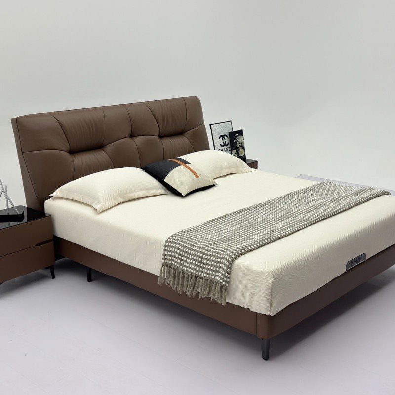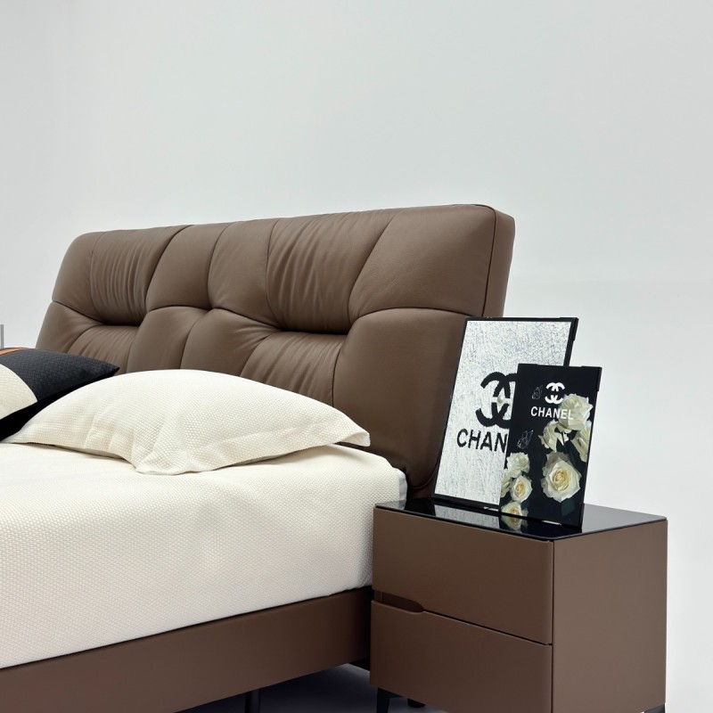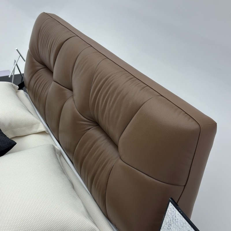 【特点】软包床头:采用头层牛皮材质,表面为方格拉扣工艺,靠包填充羽绒和丝棉,触感柔软且支撑性强,视觉上饱满立体、整体色调沉稳高级