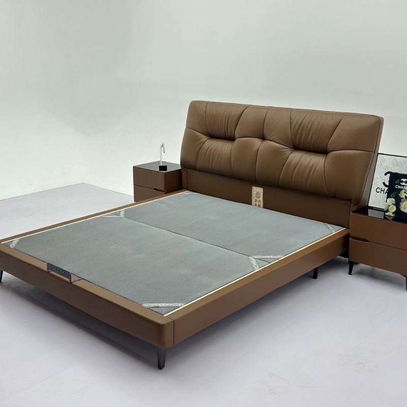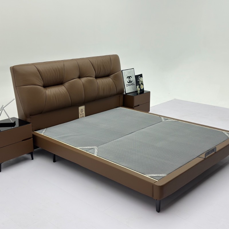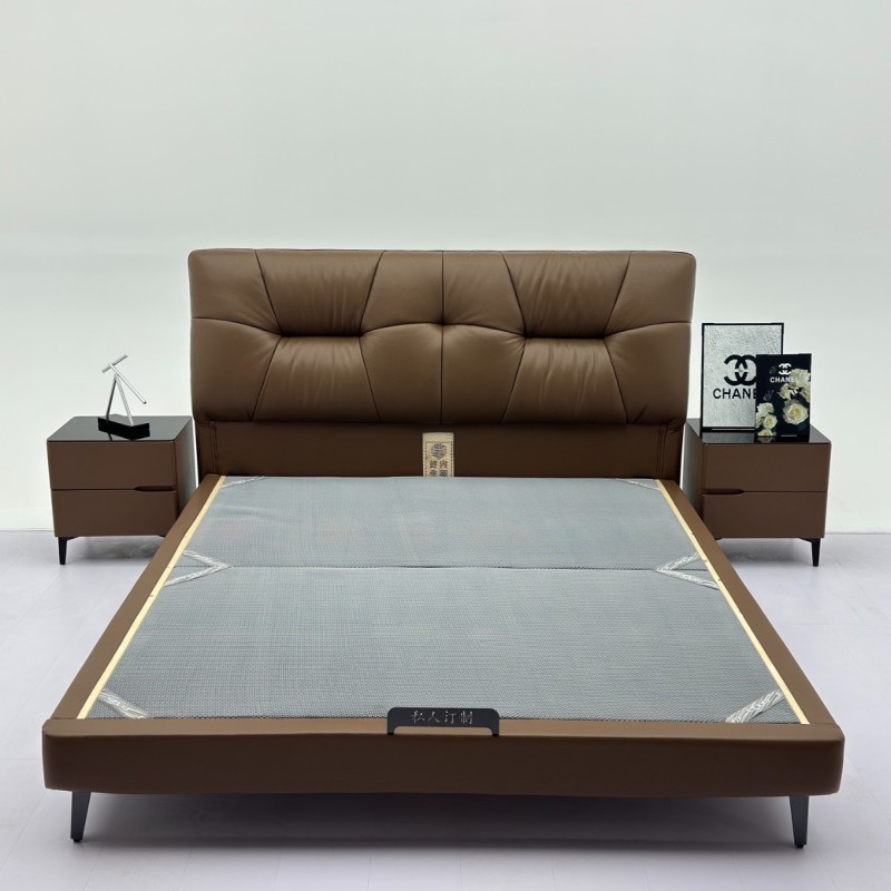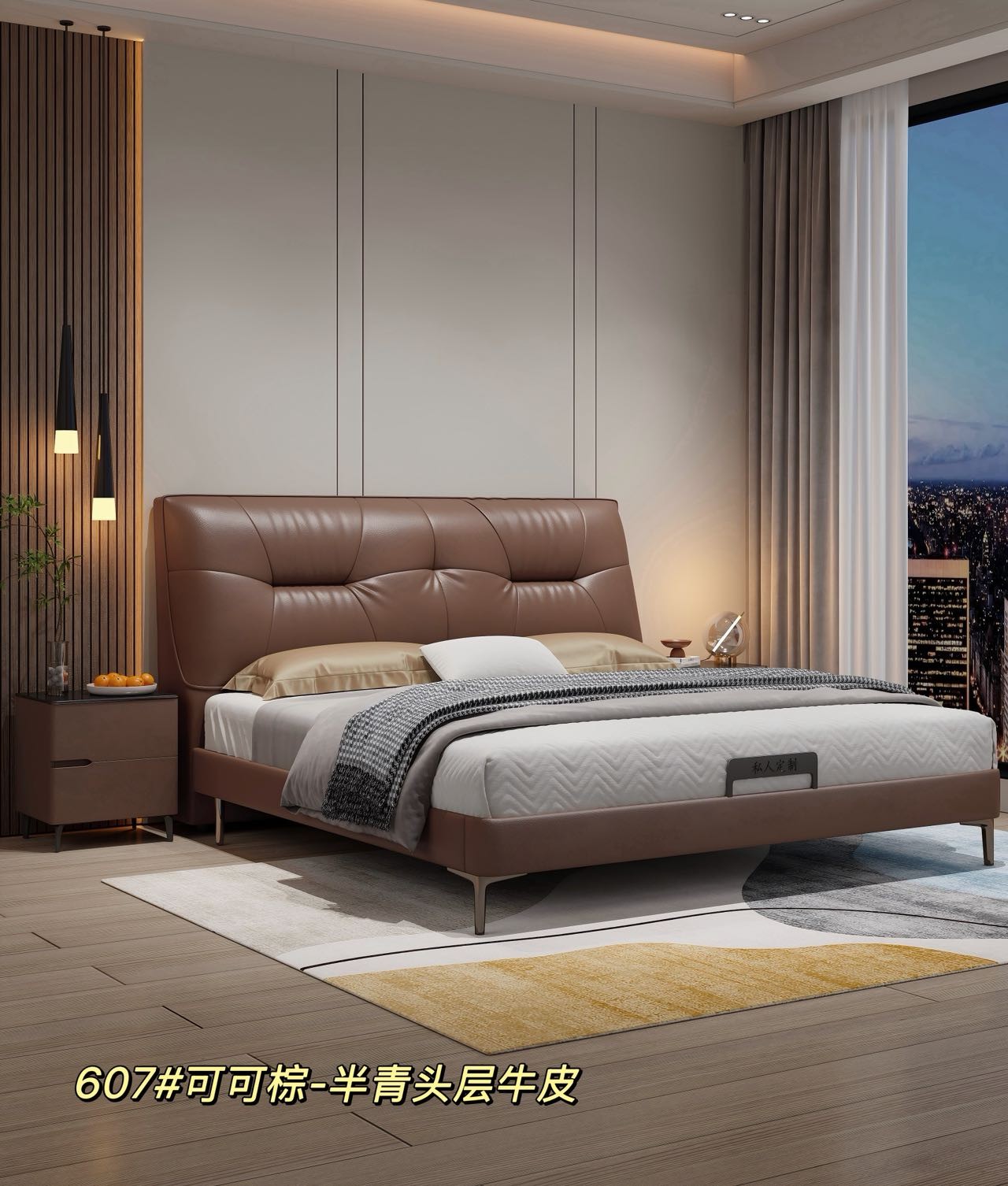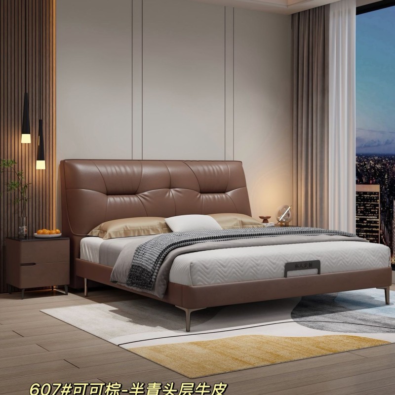 详细信息IP属地 江西赣州 新款607#【进口头层牛皮】 【型号】607# (新款) 【颜色】可可棕 【面料】进口头层牛皮 【尺寸】2200*1900*1130 【配置】8公分SF级松木床边 (软质护边工艺) 3公分9D松木满铺床板 2.5×15×9块SF级松木床板 (床板两配任选) 3×15 SF级松木大龙骨 【特点】软包床头:采用头层牛皮材质,表面为方格拉扣工艺,靠包填充羽绒和丝棉,触感柔软且支撑性强,视觉上饱满立体、整体色调沉稳高级