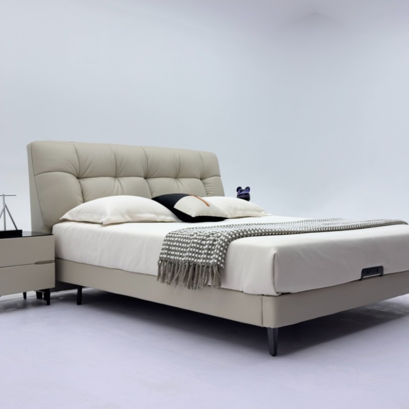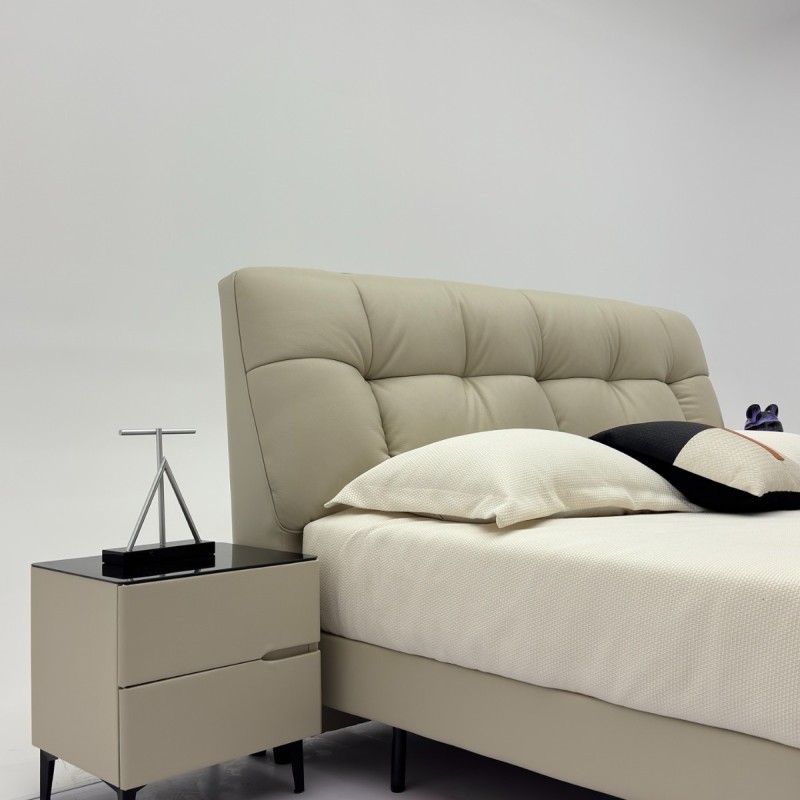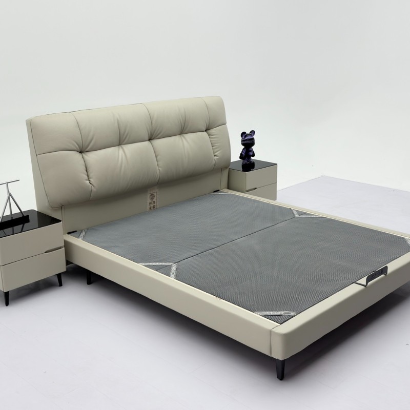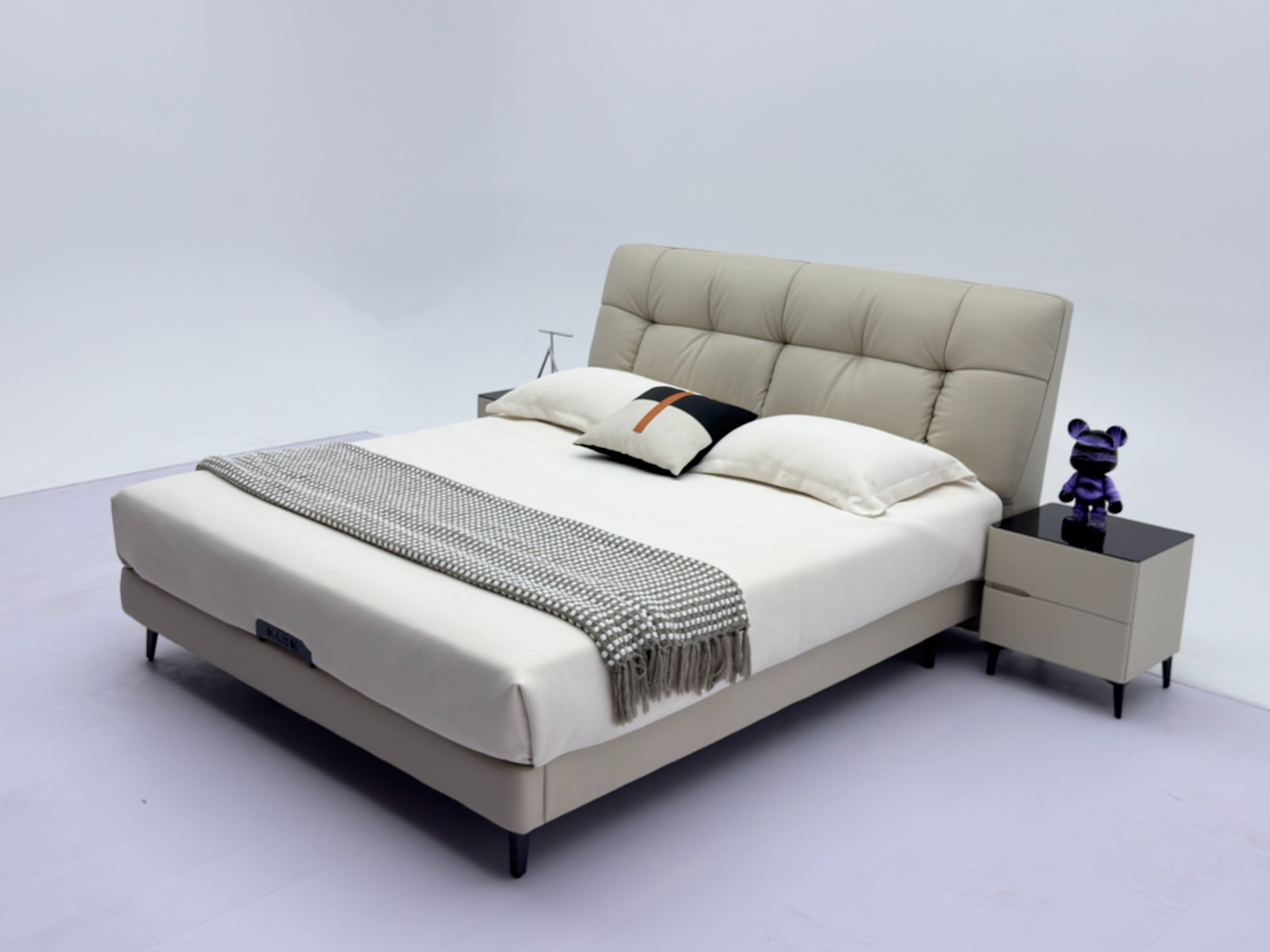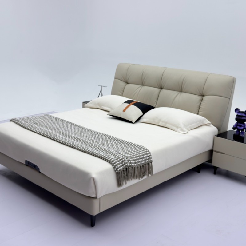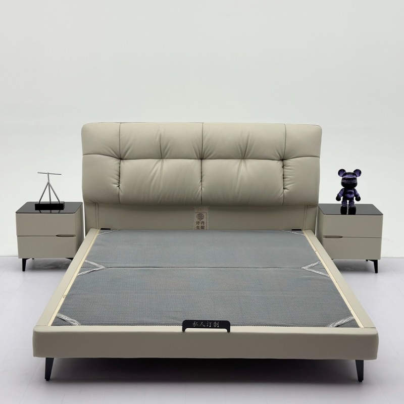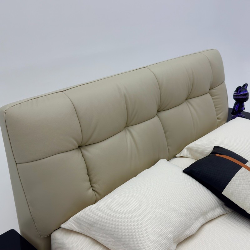 新款608#【进口头层牛皮】 【型号】608# (新款) 【颜色】珍珠白 【面料】进口头层牛皮 【尺寸】2200*1900*1130 【配置】8公分SF级松木床边 (软质护边工艺) 3公分 9D松木满铺床板 2.5×15×9块SF级松木床板 (床板两配任选) 3×15 SF级松木大龙骨 【特点】软包床头:采用头层牛皮材质,造型方格拉扣工艺,填充羽绒和丝棉,既保证了柔软包裹感,又能提供良好的颈部支撑,视觉上饱满柔和。
