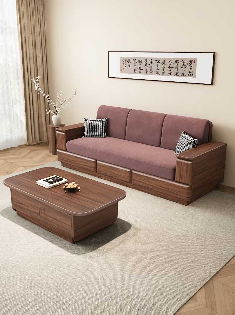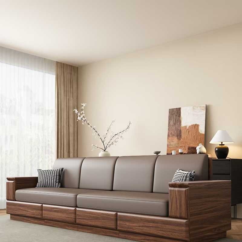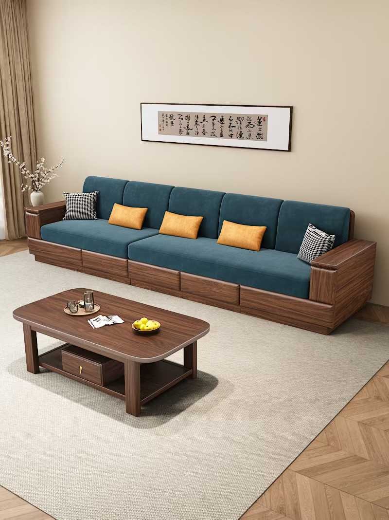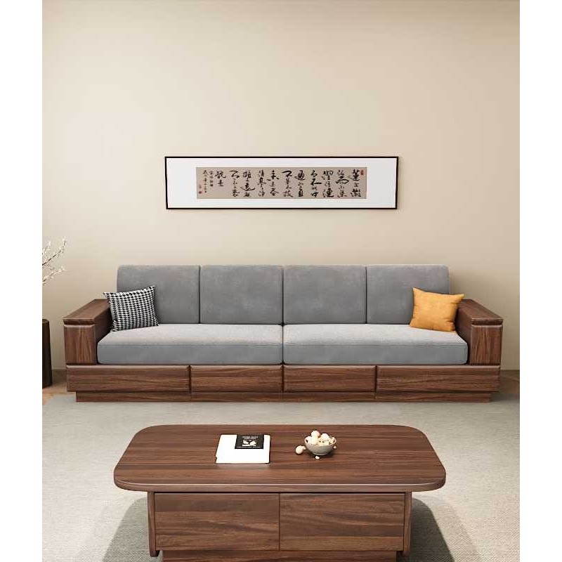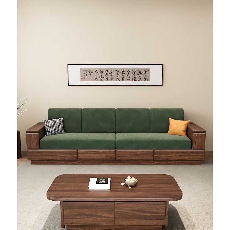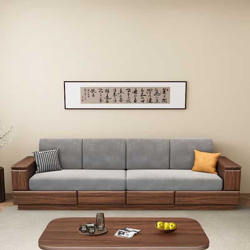 黑胡桃直排沙发,2.8米直排四人位,黑胡桃全实木, 水性漆,高密度海绵绒布面料