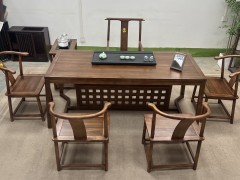 全新色系 ——宋式胡桃【观山大板】 尺寸:1.8米 2米 2.2米 2.4米 2.6米 2.8米 配置:传承主椅+传承副椅+门抽茶水柜+玻璃养生壶+木纹石80×37