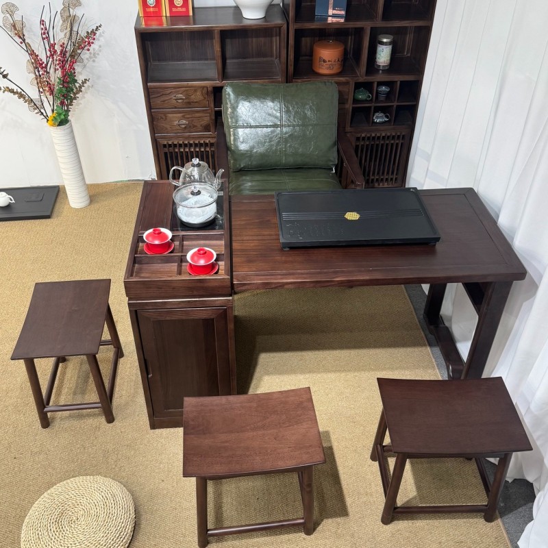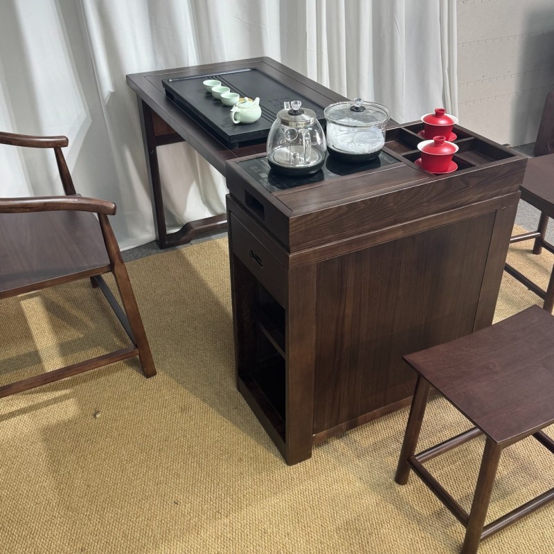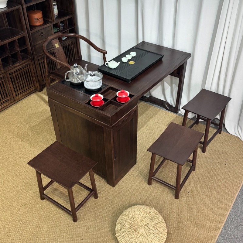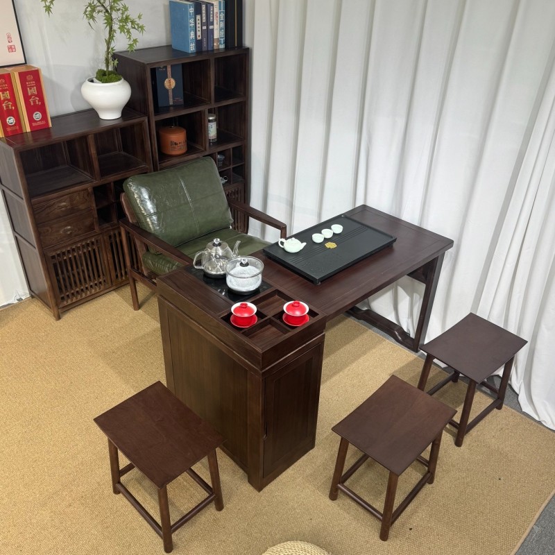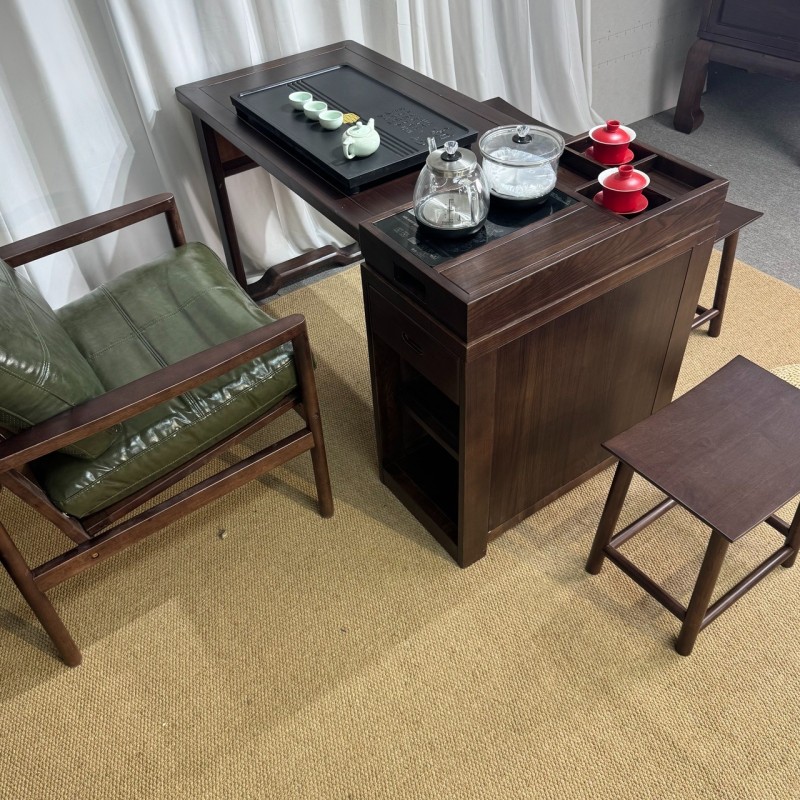 型号: 小岛台 材质: 橡木乌金工艺 颜色: 宋式胡桃色 配置: 单桌【含USB接口】+1主椅+3个元宝凳+养生炉+60*37茶盘【1.2米1.4米伸缩】