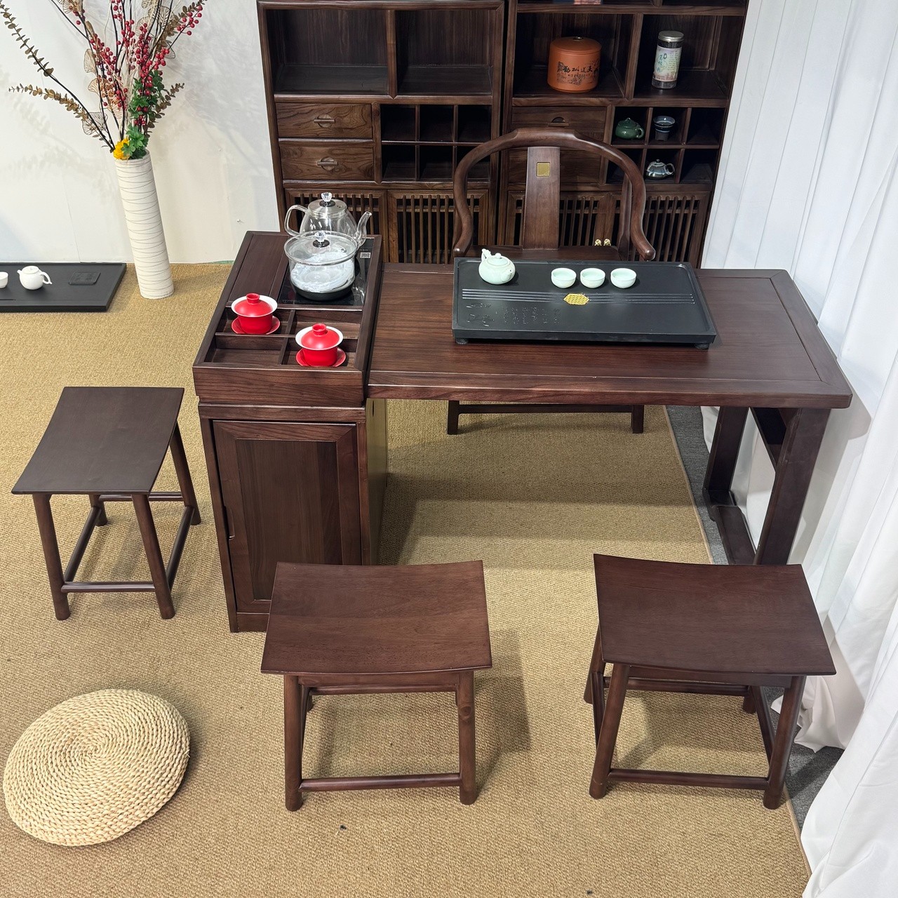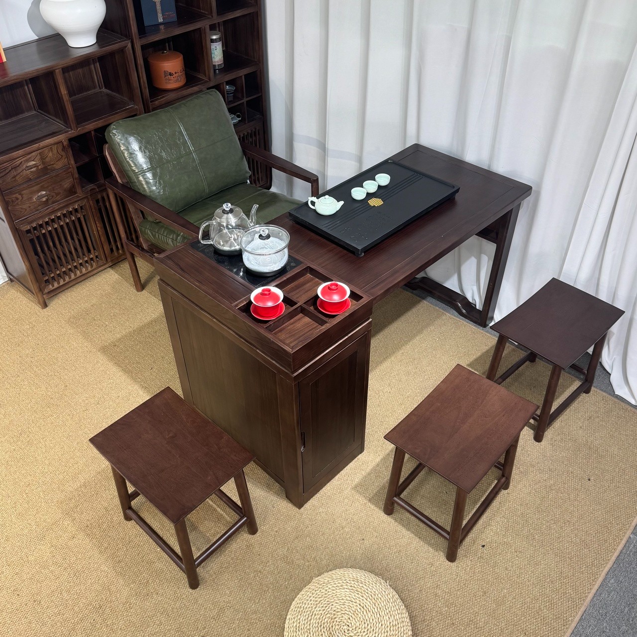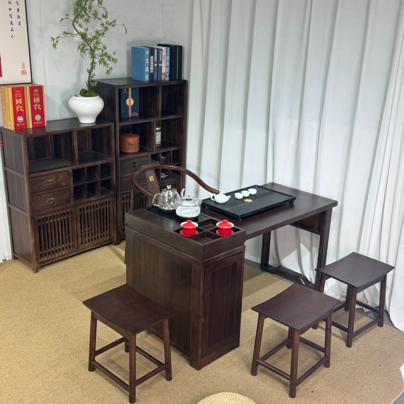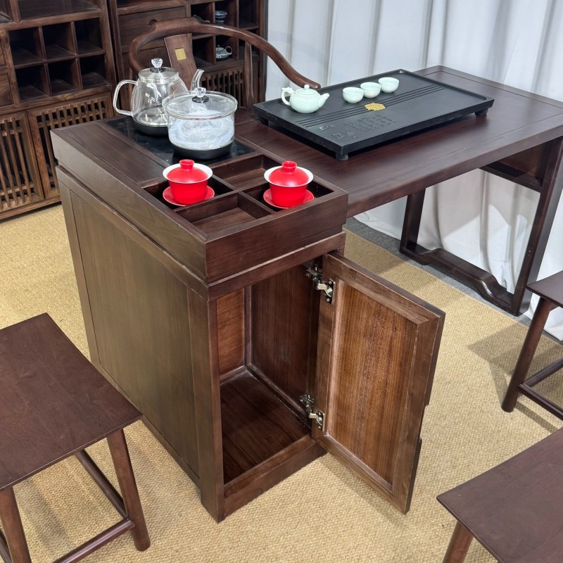 型号: 小岛台 材质: 橡木乌金工艺 颜色: 宋式胡桃色 配置: 单桌【含USB接口】+1主椅+3个元宝凳+养生炉+60*37茶盘【1.2米1.4米伸缩】